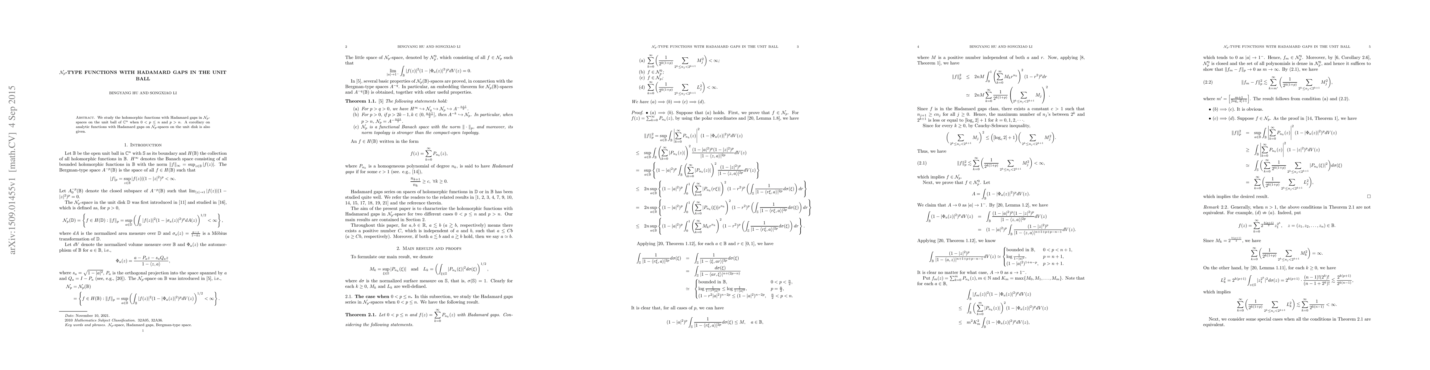 n$. A corollary on analytic functions with Hadamard gaps on $\mathcal{N}_p$-spaces on the unit disk is also given.