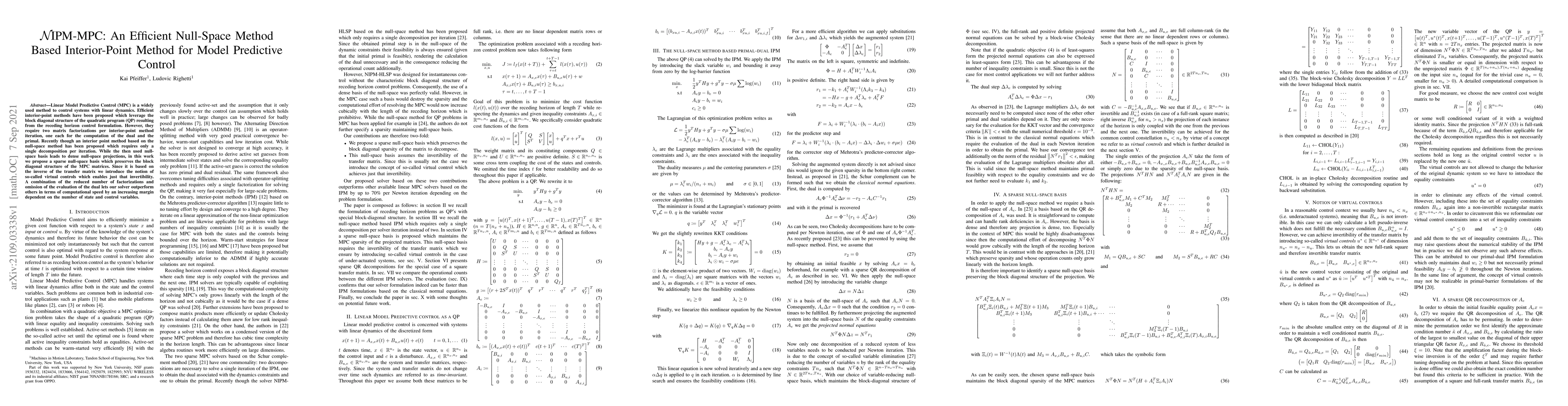This paper proposes an efficient null-space method based interior-point method for Model Predictive Control, utilizing a sparse null-space basis to maintain the block diagonal structure of MPC matrices. This approach reduces the number of matrix factorizations per iteration, leading to significant computational speed improvements.
