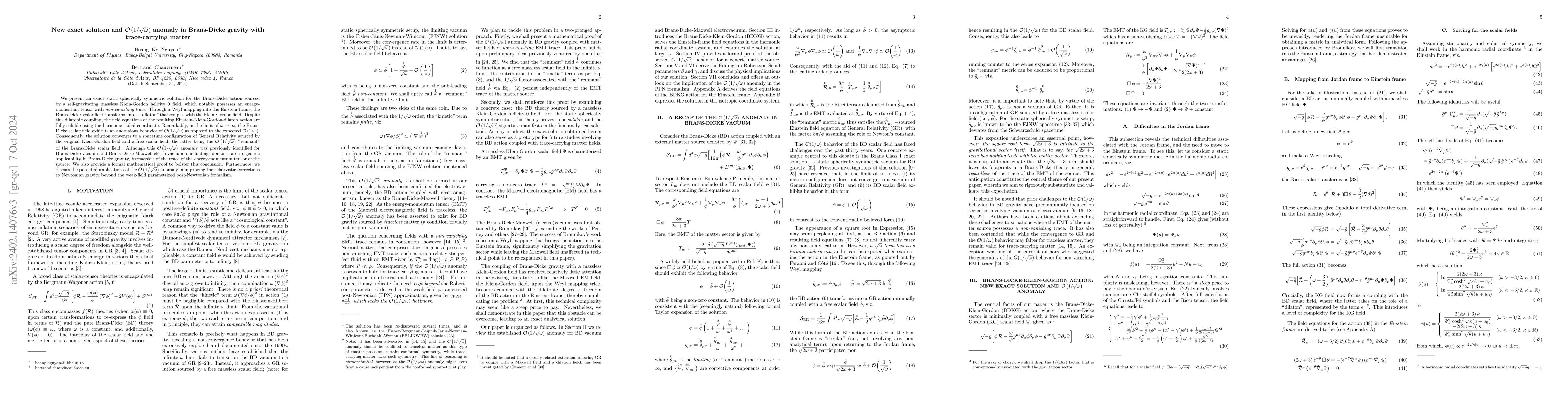 The paper presents an exact solution for Brans-Dicke gravity sourced by a massless Klein-Gordon field, revealing an ${\cal O}\,(1/\sqrt\omega)$ anomaly in the Brans-Dicke scalar field behavior, contrary to the conventional ${\cal O}\,(1/\omega)$ signature, and suggesting potential implications for relativistic corrections in Newtonian gravity.