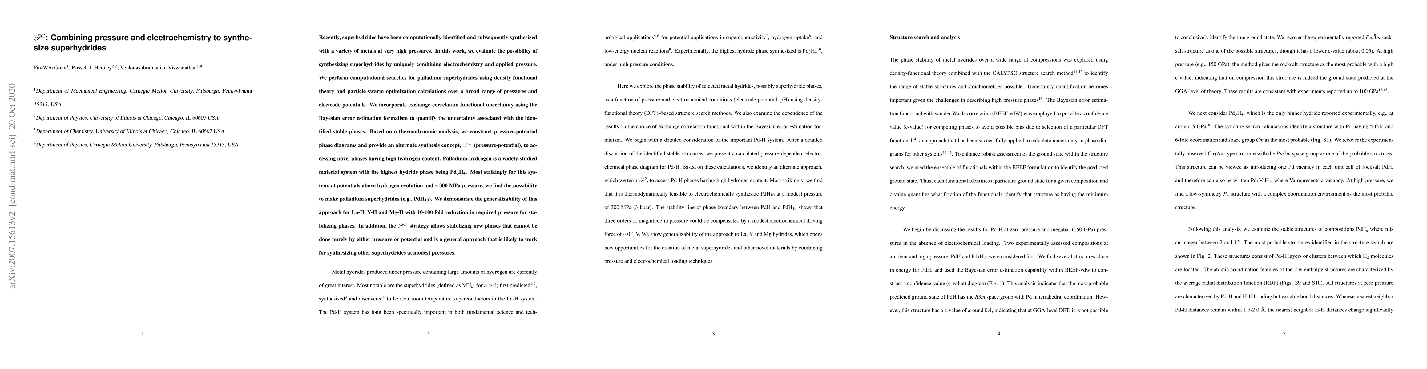 Recently, superhydrides have been computationally identified and subsequently synthesized with a variety of metals at very high pressures. In this work, we evaluate the possibility of synthesizing superhydrides by uniquely combining electrochemistry and applied pressure. We perform computational searches for palladium superhydrides using density functional theory and particle swarm optimization calculations over a broad range of pressures and electrode potentials. We incorporate exchange-correlation functional uncertainty using the Bayesian error estimation formalism to quantify the uncertainty associated with the identified stable phases. Based on a thermodynamic analysis, we construct pressure-potential phase diagrams and provide an alternate synthesis concept, $\mathcal{P}^2$ (pressure-potential), to accessing novel phases having high hydrogen content. Palladium-hydrogen is a widely-studied material system with the highest hydride phase being Pd$_3$H$_4$. Most strikingly for this system, at potentials above hydrogen evolution and $\sim$300 MPa pressure, we find the possibility to make palladium superhydrides (e.g., PdH$_{10}$). We demonstrate the generalizability of this approach for La-H, Y-H and Mg-H with 10-100 fold reduction in required pressure for stabilizing phases. In addition, the $\mathcal{P}^2$ strategy allows stabilizing new phases that cannot be done purely by either pressure or potential and is a general approach that is likely to work for synthesizing other superhydrides at modest pressures.