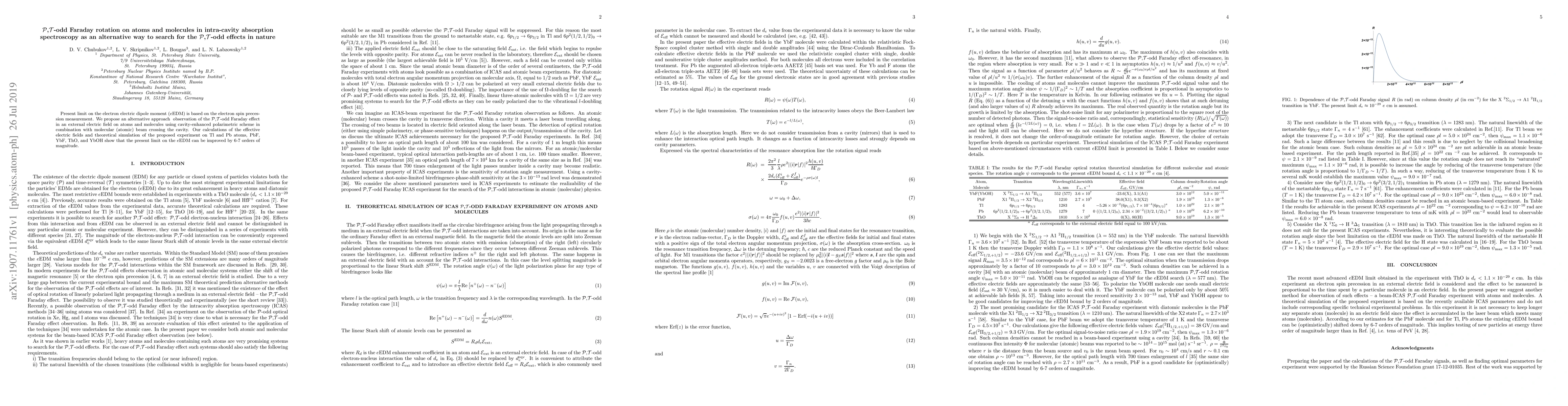 This paper proposes a novel method to detect $\mathcal{P}$,$\mathcal{T}$-odd effects through the observation of the $\mathcal{P}$,$\mathcal{T}$-odd Faraday rotation in atoms and molecules using intra-cavity absorption spectroscopy. The proposed technique aims to improve the current limit on the electron electric dipole moment by 6-7 orders of magnitude, offering a significant advancement in the search for $\mathcal{P}$,$\mathcal{T}$-odd phenomena.