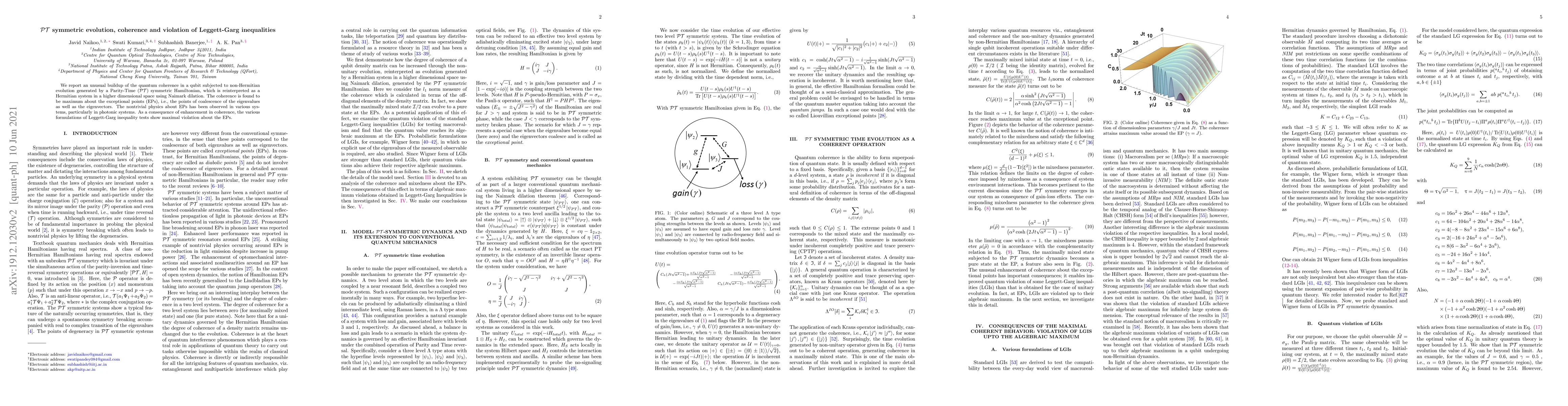 We report an unusual buildup of the quantum coherence in a qubit subjected to non-Hermitian evolution generated by a Parity-Time ($\mathcal{PT}$) symmetric Hamiltonian, which is reinterpreted as a Hermitian system in a higher dimensional space using Naimark dilation. The coherence is found to be maximum about the exceptional points (EPs), i.e., the points of coalescence of the eigenvalues as well as the eigenvectors. The nontrivial physics about EPs has been observed in various systems, particularly in photonic systems. As a consequence of enhancement in coherence, the various formulations of Leggett-Garg inequality tests show maximal violation about the EPs.