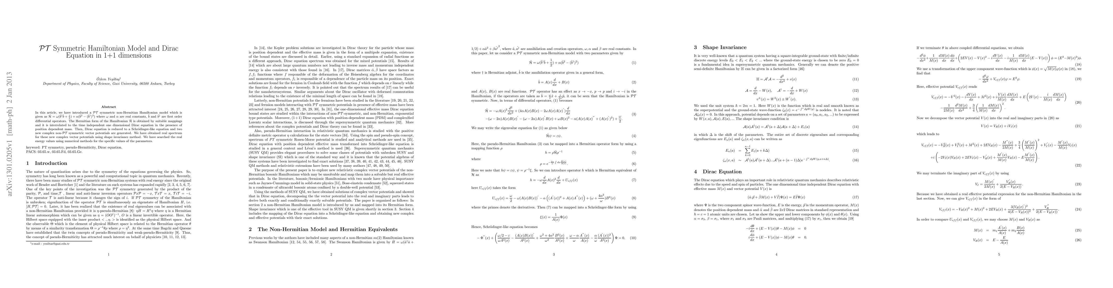 In this article, we have introduced a $\mathcal{PT}$ symmetric non-Hermitian Hamiltonian model which is given as $\hat{\mathcal{H}}=\omega (\hat{b}^{\dag}\hat{b}+1/2)+ \alpha (\hat{b}^{2}-(\hat{b}^{\dag})^{2})$ where $\omega$ and $\alpha$ are real constants, $\hat{b}$ and $\hat{b^{\dag}}$ are first order differential operators. The Hermitian form of the Hamiltonian $\mathcal{\hat{H}}$ is obtained by suitable mappings and it is interrelated to the time independent one dimensional Dirac equation in the presence of position dependent mass. Then, Dirac equation is reduced to a Schr\"{o}dinger-like equation and two new complex non-$\mathcal{PT}$ symmetric vector potentials are generated. We have obtained real spectrum for these new complex vector potentials using shape invariance method. We have searched the real energy values using numerical methods for the specific values of the parameters.