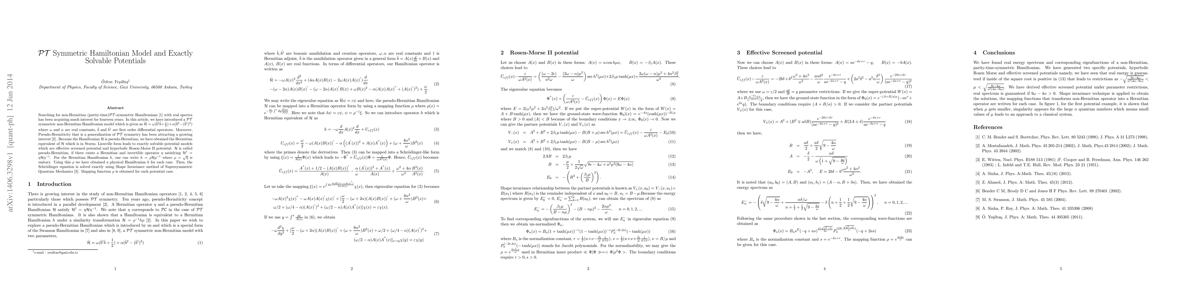 This paper introduces a $\mathcal{PT}$ symmetric non-Hermitian Hamiltonian model and explores its pseudo-Hermitian properties. It derives Hermitian equivalents for exactly solvable potentials, including the screened potential and hyperbolic Rosen-Morse II potential, using the Shape Invariance method from Supersymmetric Quantum Mechanics.