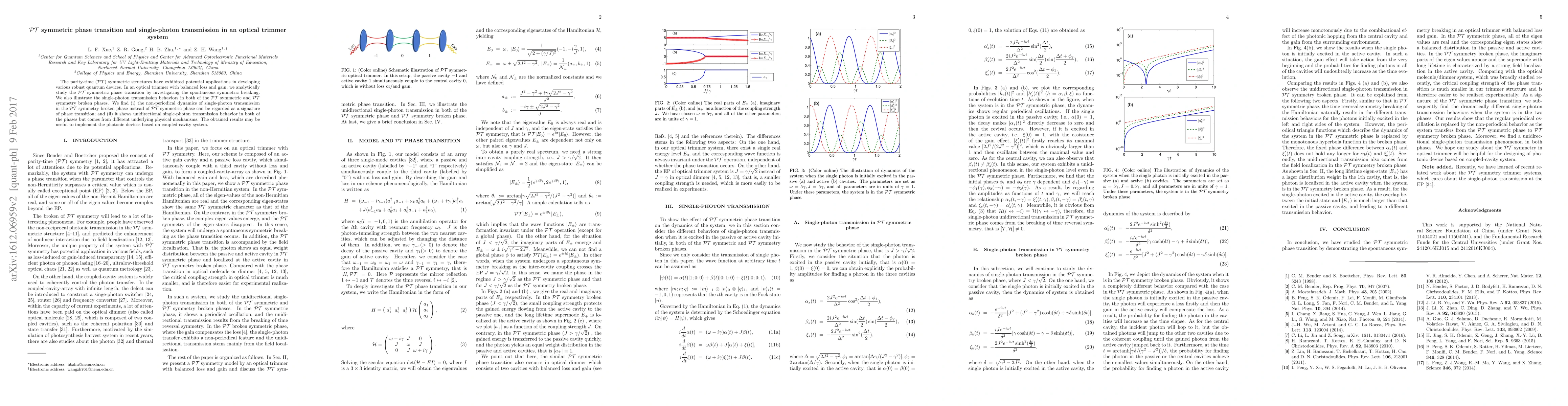 The parity-time ($\mathcal{PT}$) symmetric structures have exhibited potential applications in developing various robust quantum devices. In an optical trimmer with balanced loss and gain, we analytically study the $\mathcal{PT}$ symmetric phase transition by investigating the spontaneous symmetric breaking. We also illustrate the single-photon transmission behaviors in both of the $\mathcal{PT}$ symmetric and $\mathcal{PT}$ symmetry broken phases. We find (i) the non-periodical dynamics of single-photon transmission in the $\mathcal{PT}$ symmetry broken phase instead of $\mathcal{PT}$ symmetric phase can be regarded as a signature of phase transition; and (ii) it shows unidirectional single-photon transmission behavior in both of the phases but comes from different underlying physical mechanisms. The obtained results may be useful to implement the photonic devices based on coupled-cavity system.