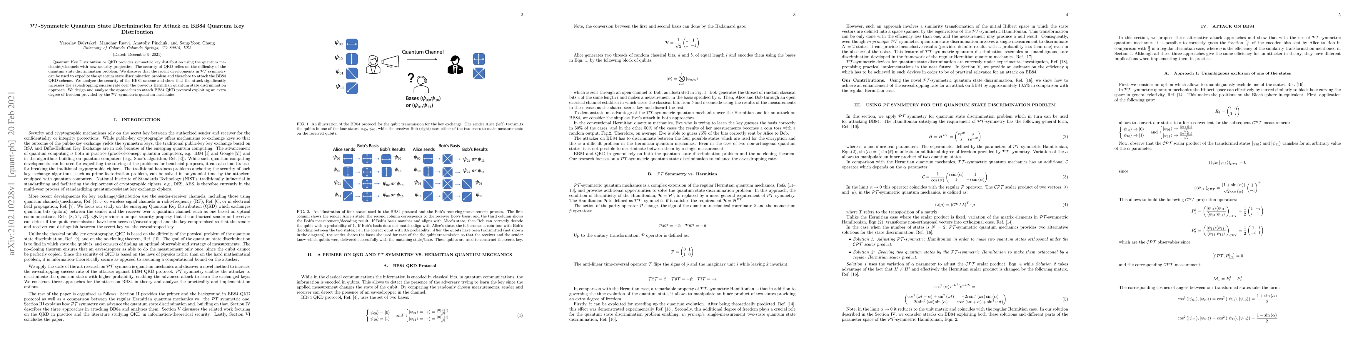 Quantum Key Distribution or QKD provides symmetric key distribution using the quantum mechanics/channels with new security properties. The security of QKD relies on the difficulty of the quantum state discrimination problem. We discover that the recent developments in $\mathcal{PT}$ symmetry can be used to expedite the quantum state discrimination problem and therefore to attack the BB84 QKD scheme. We analyze the security of the BB84 scheme and show that the attack significantly increases the eavesdropping success rate over the previous Hermitian quantum state discrimination approach. We design and analyze the approaches to attack BB84 QKD protocol exploiting an extra degree of freedom provided by the $\mathcal{PT}$-symmetric quantum mechanics.