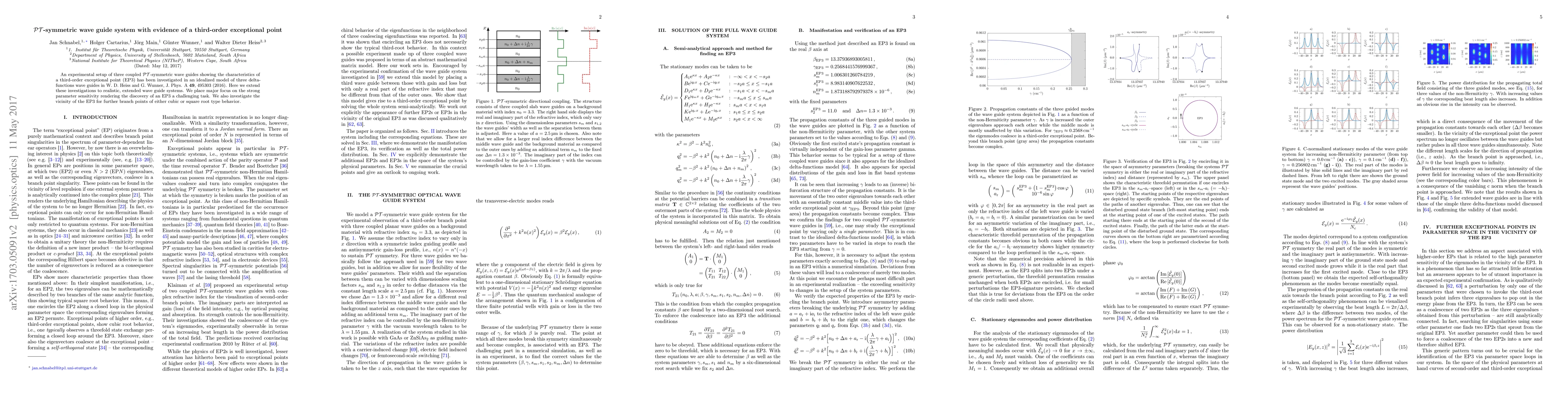 An experimental setup of three coupled $\mathcal{PT}$-symmetric wave guides showing the characteristics of a third-order exceptional point (EP3) has been investigated in an idealized model of three delta-functions wave guides in W.~D. Heiss and G.~Wunner, J. Phys. A 49, 495303 (2016). Here we extend these investigations to realistic, extended wave guide systems. We place major focus on the strong parameter sensitivity rendering the discovery of an EP3 a challenging task. We also investigate the vicinity of the EP3 for further branch points of either cubic or square root type behavior.