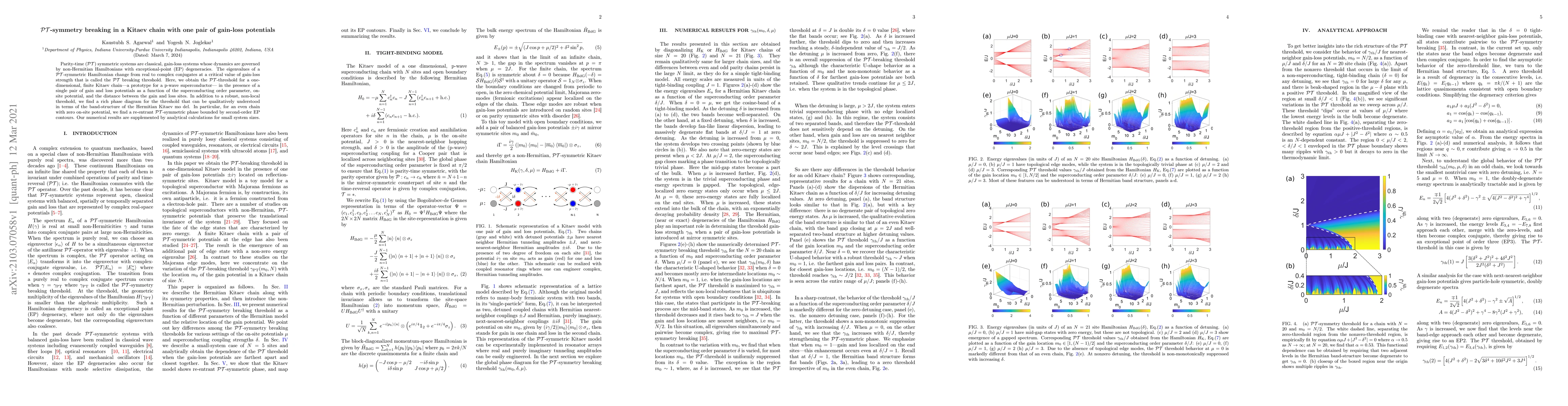 Parity-time ($\mathcal{PT}$) symmetric systems are classical, gain-loss systems whose dynamics are governed by non-Hermitian Hamiltonians with exceptional-point (EP) degeneracies. The eigenvalues of a $\mathcal{PT}$-symmetric Hamiltonian change from real to complex conjugates at a critical value of gain-loss strength that is called the $\mathcal{PT}$ breaking threshold. Here, we obtain the $\mathcal{PT}$-threshold for a one-dimensional, finite Kitaev chain -- a prototype for a p-wave superconductor -- in the presence of a single pair of gain and loss potentials as a function of the superconducting order parameter, on-site potential, and the distance between the gain and loss sites. In addition to a robust, non-local threshold, we find a rich phase diagram for the threshold that can be qualitatively understood in terms of the band-structure of the Hermitian Kitaev mo del. In particular, for an even chain with zero on-site potential, we find a re-entrant $\mathcal{PT}$-symmetric phase bounded by second-order EP contours. Our numerical results are supplemented by analytical calculations for small system sizes.