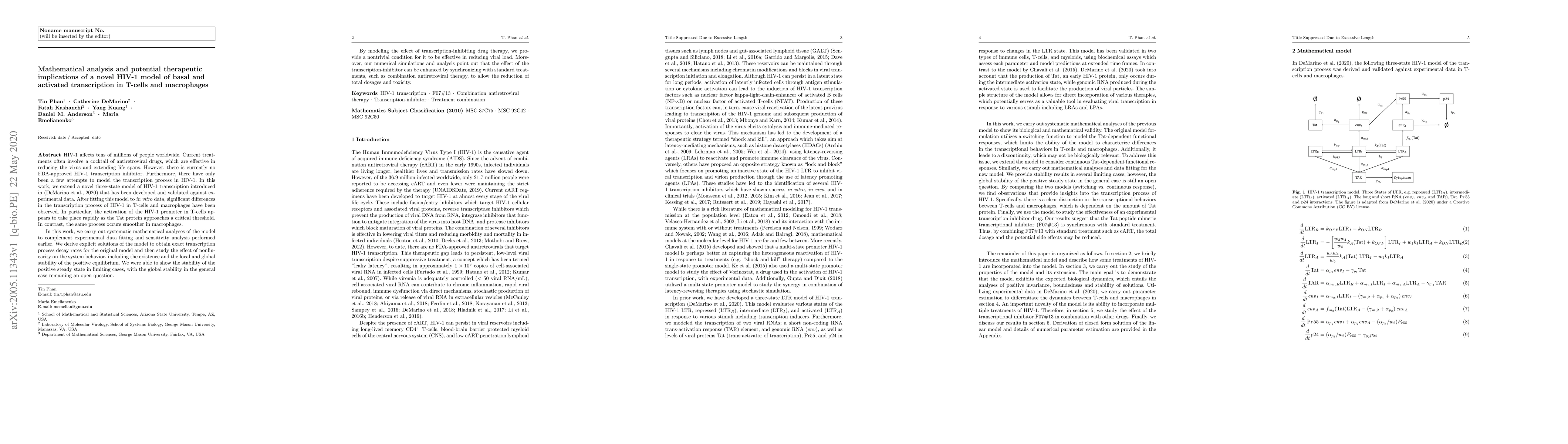 HIV-1 affects tens of millions of people worldwide. Current treatments often involve a cocktail of antiretroviral drugs, which are effective in reducing the virus and extending life spans. However, there is currently no FDA-approved HIV-1 transcription inhibitor. Furthermore, there have only been a few attempts to model the transcription process in HIV-1. In this work, we extend a novel three-state model of HIV-1 transcription introduced in DeMarino et al. (2020) that has been developed and validated against experimental data. After fitting this model to in vitro data, significant differences in the transcription process of HIV-1 in T-cells and macrophages have been observed. In particular, the activation of the HIV-1 promoter in T-cells appears to take place rapidly as the Tat protein approaches a critical threshold. In contrast, the same process occurs smoother in macrophages. In this work, we carry out systematic mathematical analyses of the model to complement experimental data fitting and sensitivity analysis performed earlier. We derive explicit solutions of the model to obtain exact transcription process decay rates for the original model and then study the effect of nonlinearity on the system behavior, including the existence and the local and global stability of the positive equilibrium. We were able to show the stability of the positive steady state in limiting cases, with the global stability in the general case remaining an open question. By modeling the effect of transcription-inhibiting drug therapy, we provide a nontrivial condition for it to be effective in reducing viral load. Moreover, our numerical simulations and analysis point out that the effect of the transcription-inhibitor can be enhanced by synchronizing with standard treatments, such as combination antiretroviral therapy, to allow the reduction of total dosages and toxicity.