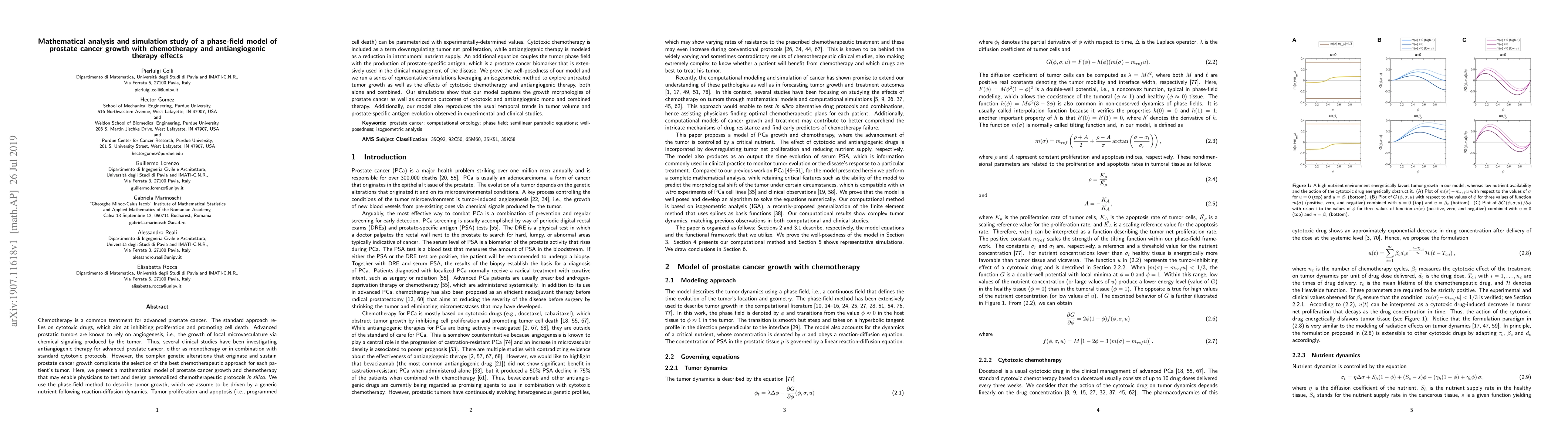 This paper presents a mathematical model using phase-field theory to simulate prostate cancer growth influenced by chemotherapy and antiangiogenic therapy. The model incorporates reaction-diffusion dynamics for tumor proliferation and apoptosis, and it demonstrates the potential for personalized chemotherapeutic protocol design.