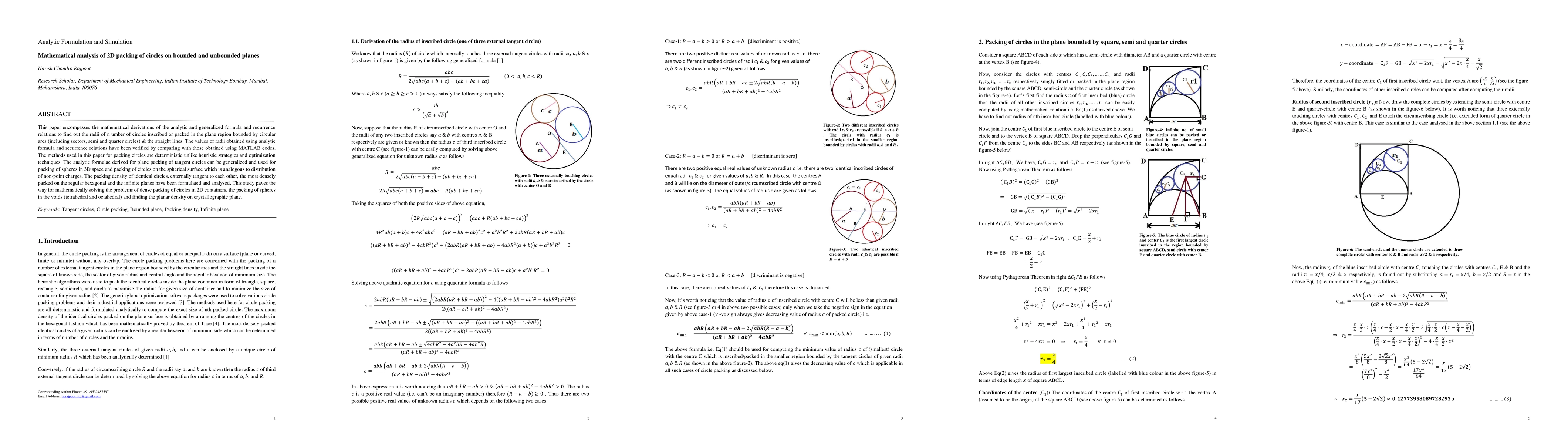 This paper encompasses the mathematical derivations of the analytic and generalized formula and recurrence relations to find out the radii of n umber of circles inscribed or packed in the plane region bounded by circular arcs (including sectors, semi and quarter circles) & the straight lines. The values of radii obtained using analytic formula and recurrence relations have been verified by comparing with those obtained using MATLAB codes. The methods used in this paper for packing circles are deterministic unlike heuristic strategies and optimization techniques. The analytic formulae derived for plane packing of tangent circles can be generalized and used for packing of spheres in 3D space and packing of circles on the spherical surface which is analogous to distribution of non-point charges. The packing density of identical circles, externally tangent to each other, the most densely packed on the regular hexagonal and the infinite planes have been formulated and analysed. This study paves the way for mathematically solving the problems of dense packing of circles in 2D containers, the packing of spheres in the voids (tetrahedral and octahedral) and finding the planar density on crystallographic plane.