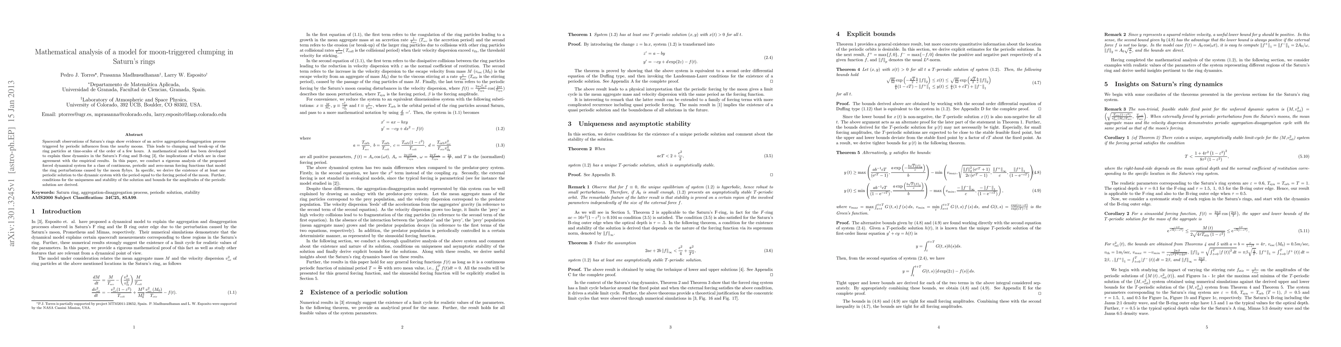 This paper rigorously analyzes a mathematical model for moon-triggered clumping in Saturn's rings, deriving the existence of periodic solutions matching the moon's forcing period, and establishing conditions for their uniqueness and stability.