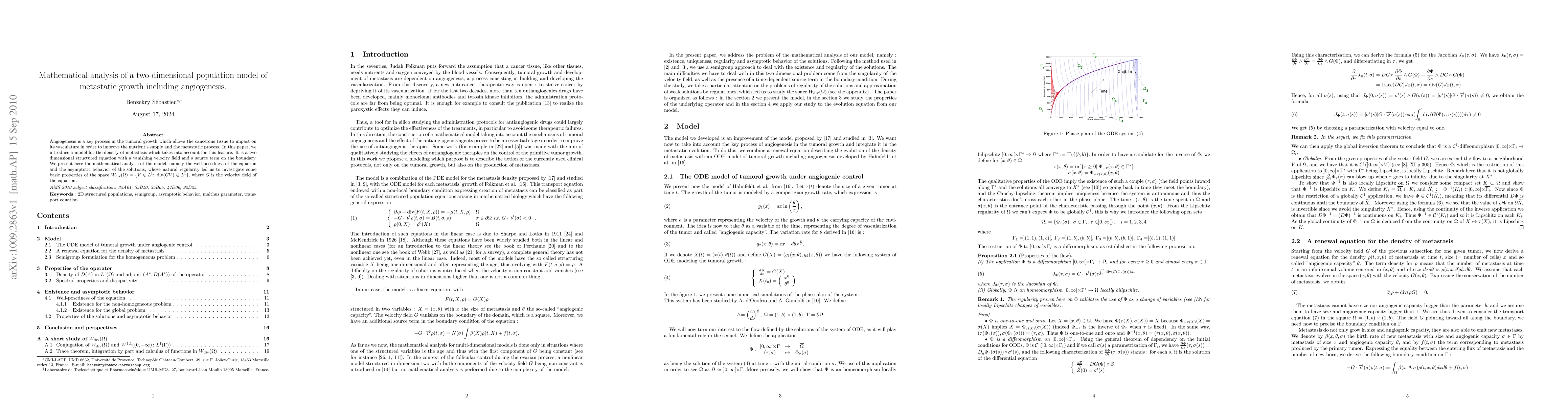 This paper mathematically analyzes a two-dimensional model for metastatic growth that incorporates angiogenesis, focusing on the well-posedness and asymptotic behavior of the solutions. The model features a structured equation with a vanishing velocity field and a boundary source term, and explores properties of the space $\Wd(\Om)$.