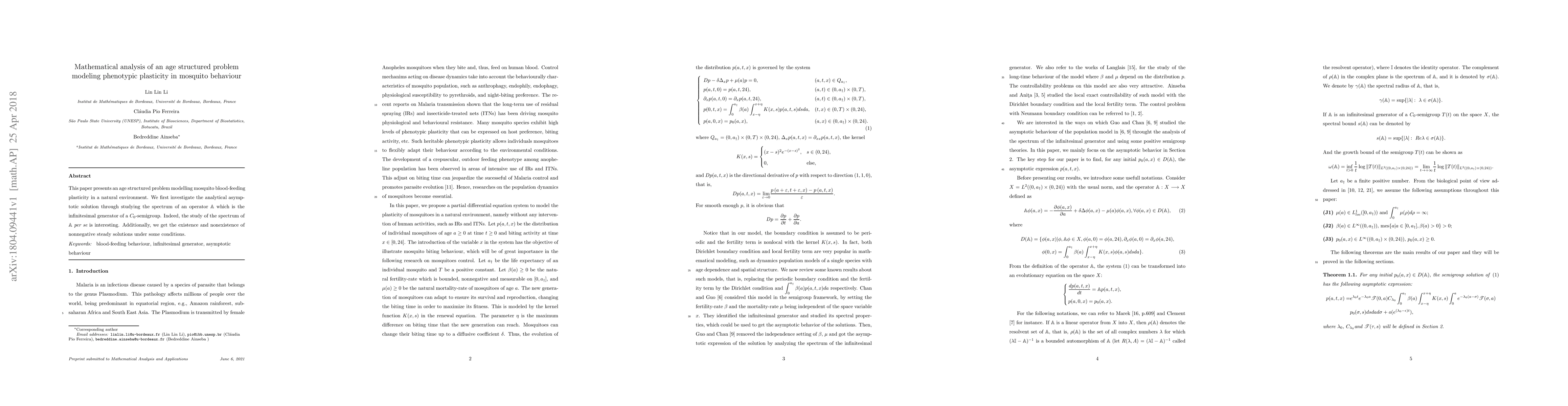 This paper presents an age structured problem modelling mosquito blood-feeding plasticity in a natural environment. We first investigate the analytical asymptotic solution through studying the spectrum of an operator $\mathbb{A}$ which is the infinitesimal generator of a $C_0$-semigroup. Indeed, the study of the spectrum of $\mathbb{A}$ {\it per se} is interesting. Additionally, we get the existence and nonexistence of nonnegative steady solutions under some conditions.