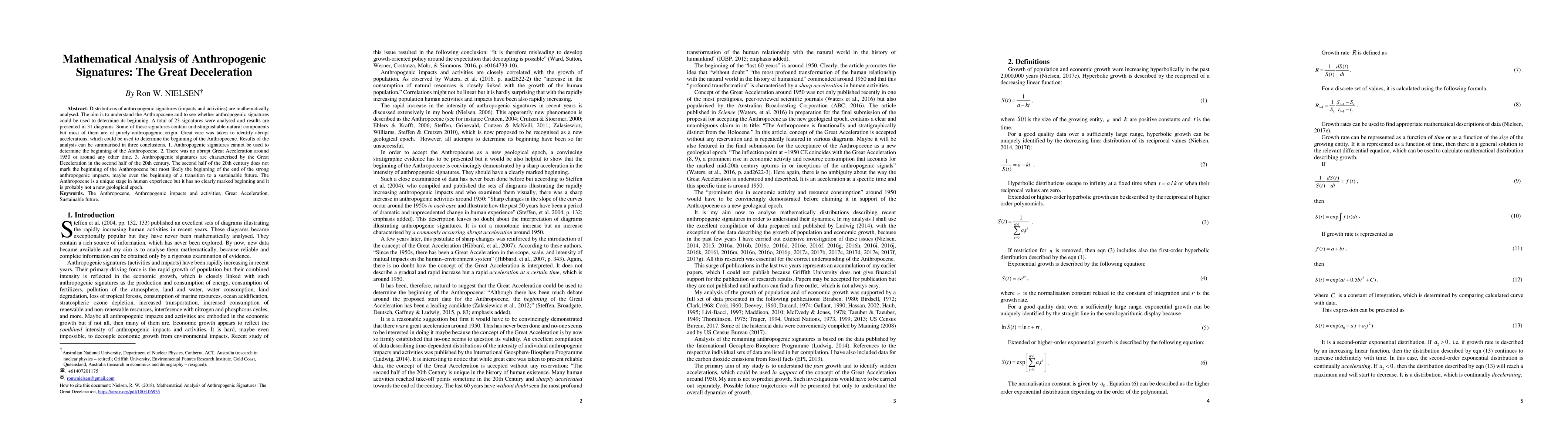 This paper mathematically analyzes 23 anthropogenic signatures to determine the onset of the Anthropocene, concluding that no clear beginning exists and that the Anthropocene lacks a distinct geological epoch status. The study finds no Great Acceleration but identifies a Great Deceleration in the latter half of the 20th century.