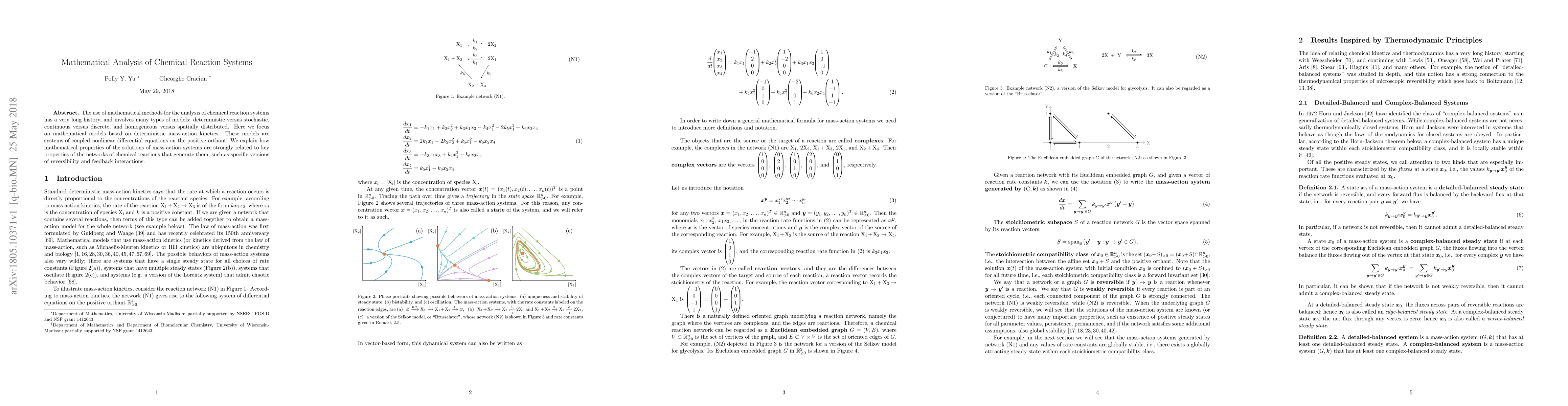 The use of mathematical methods for the analysis of chemical reaction systems has a very long history, and involves many types of models: deterministic versus stochastic, continuous versus discrete, and homogeneous versus spatially distributed. Here we focus on mathematical models based on deterministic mass-action kinetics. These models are systems of coupled nonlinear differential equations on the positive orthant. We explain how mathematical properties of the solutions of mass-action systems are strongly related to key properties of the networks of chemical reactions that generate them, such as specific versions of reversibility and feedback interactions.