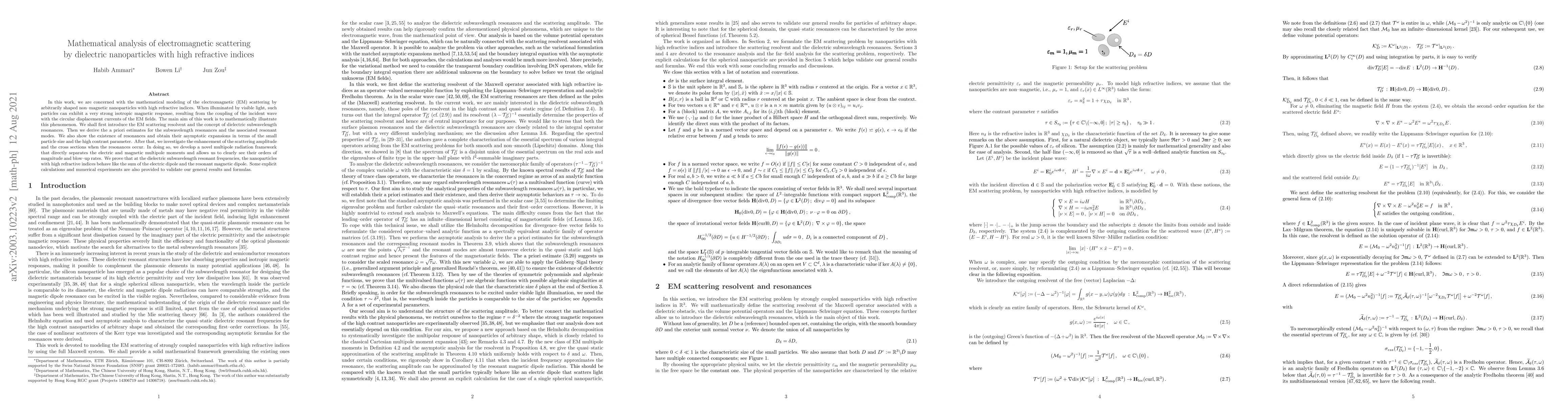 This paper explores the mathematical modeling of electromagnetic scattering by non-magnetic dielectric nanoparticles with high refractive indices, focusing on the coupling of incident waves with circular displacement currents. The study introduces a novel multipole radiation framework to analyze the enhancement of scattering amplitude and cross sections at dielectric subwavelength resonances.