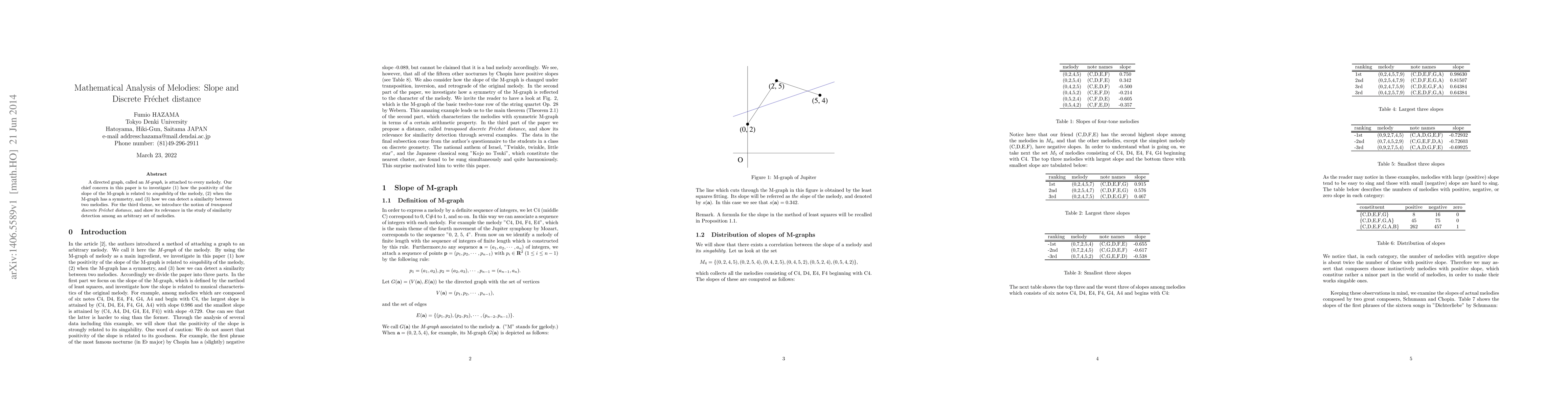 A directed graph, called an M-graph, is attached to every melody. Our chief concern in this paper is to investigate (1) how the positivity of the slope of the M-graph is related to singability of the melody, (2) when the M-graph has a symmetry, and (3) how we can detect a similarity between two melodies. For the third theme, we introduce the notion of transposed discrete Frechet distance, and show its relevance in the study of similarity detection among an arbitrary set of melodies.