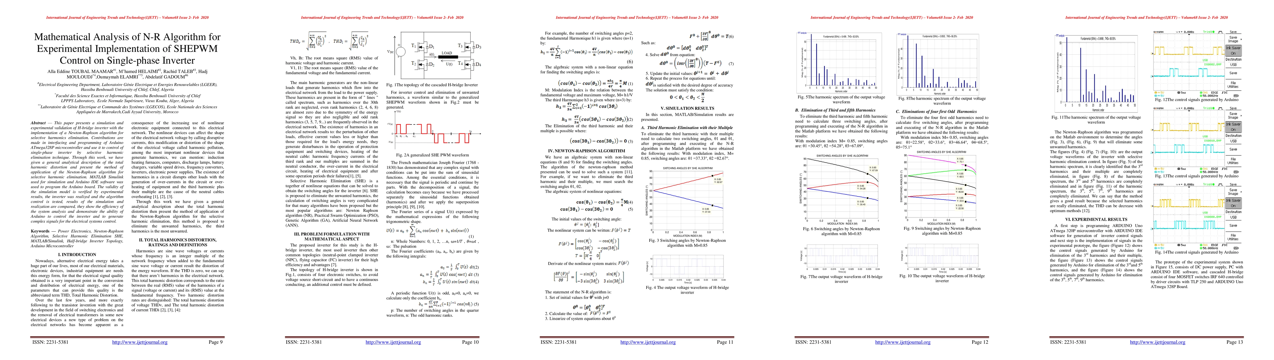 This paper details the implementation and analysis of a selective harmonic elimination (SHEPWM) control algorithm using a Newton-Raphson method for a single-phase inverter, validated through both simulation and experimental setup on an H-bridge inverter controlled by an Arduino ATmega328P. Results demonstrate the effectiveness of the algorithm and the microcontroller’s capability for complex signal generation.