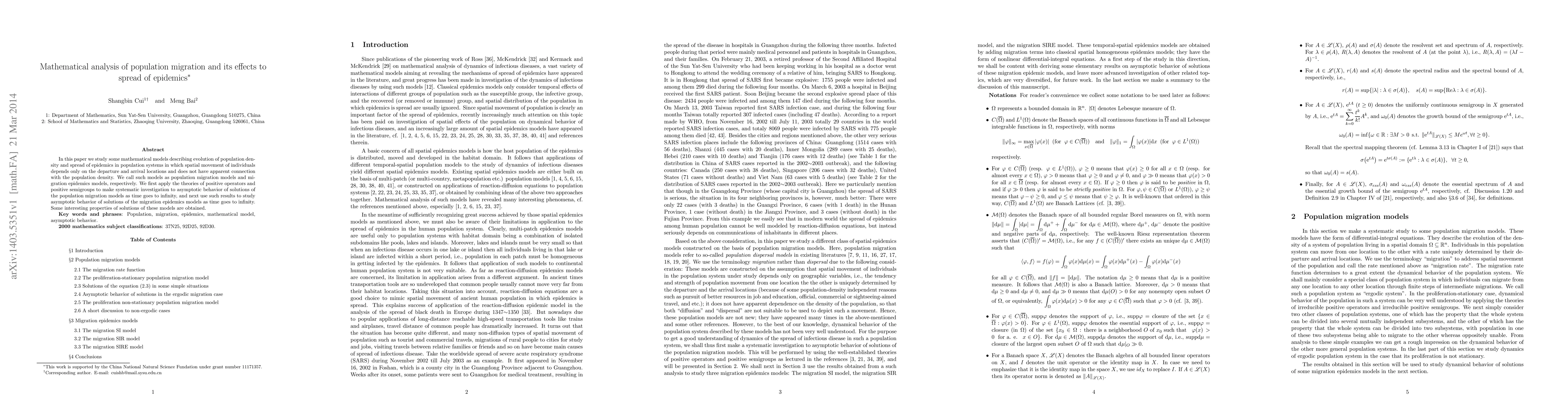 This paper investigates mathematical models for population migration and the spread of epidemics, employing theories of positive operators and semigroups to analyze the long-term behavior of both migration and migration-related epidemic models, revealing interesting properties of their solutions.