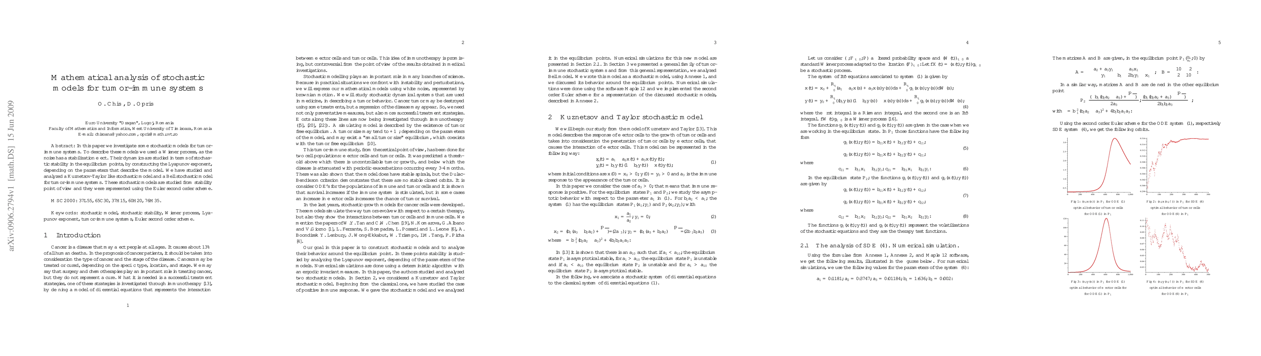 This paper analyzes stochastic models for tumor-immune interactions, using Wiener processes to account for noise stabilization. It examines the stability of equilibrium points through Lyapunov exponents and investigates two specific models—Kuznetsov-Taylor and Bell—using the Euler second order scheme.