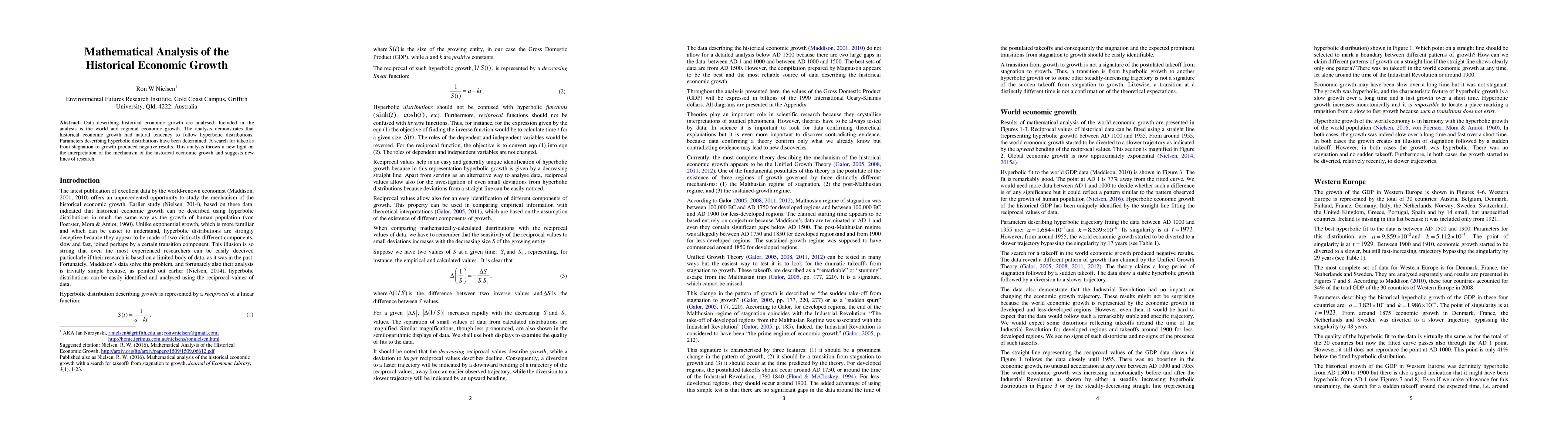This paper analyzes historical economic growth data, revealing a natural tendency for growth to follow hyperbolic distributions. Despite searching for transitions from stagnation to growth, no such takeoffs were found, suggesting new interpretations and research directions for understanding historical economic mechanisms.