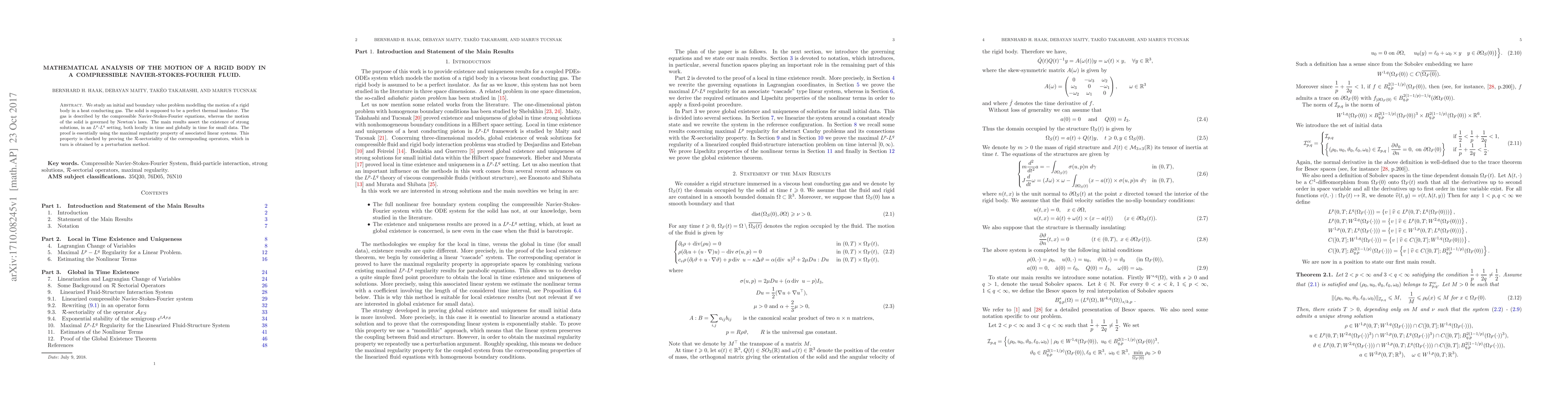 We study an initial and boundary value problem modelling the motion of a rigid body in a heat conducting gas. The solid is supposed to be a perfect thermal insulator. The gas is described by the compressible Navier-Stokes-Fourier equations, whereas the motion of the solid is governed by Newton's laws. The main results assert the existence of strong solutions, in an L p-L q setting, both locally in time and globally in time for small data. The proof is essentially using the maximal regularity property of associated linear systems. This property is checked by proving the R-sectoriality of the corresponding operators, which in turn is obtained by a perturbation method.