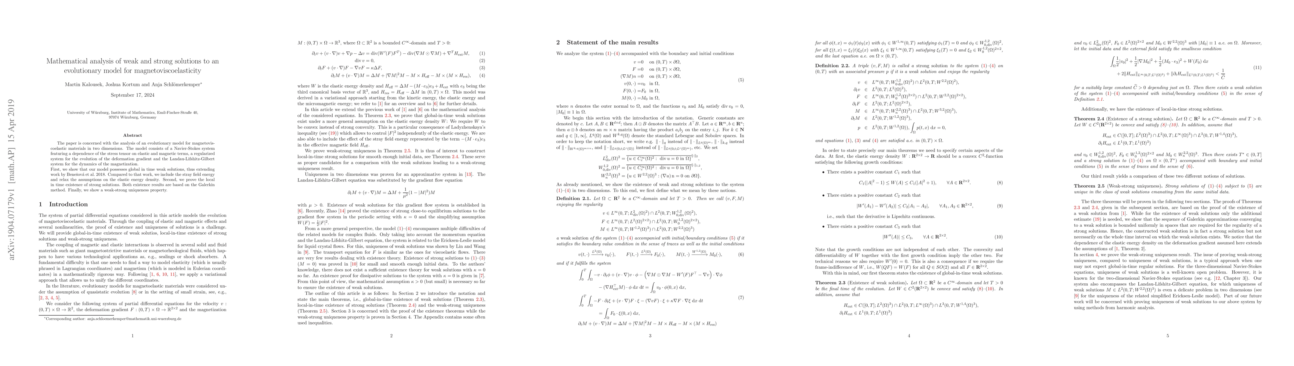 This paper analyzes an evolutionary model for magnetoviscoelastic materials, proving global weak solutions and local strong solutions using the Galerkin method, while extending previous work by including stray field energy and relaxing elastic energy assumptions. It also demonstrates a weak-strong uniqueness property.