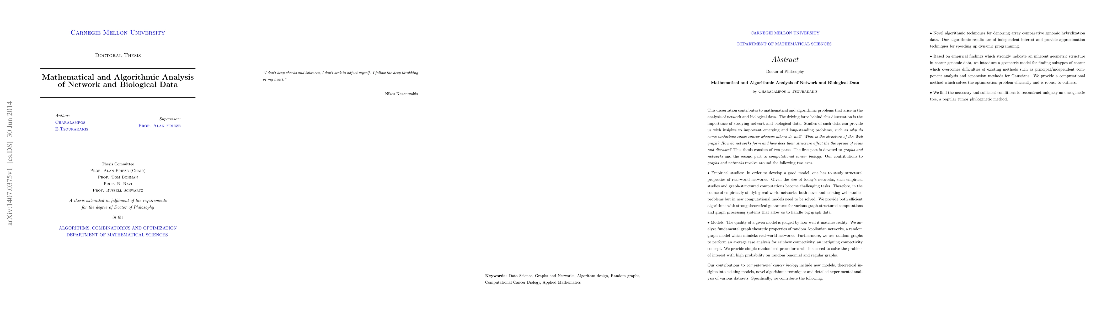 Summary: This dissertation explores mathematical and algorithmic approaches to address complex problems in analyzing network and biological data, aiming to enhance understanding and processing of these intricate datasets.