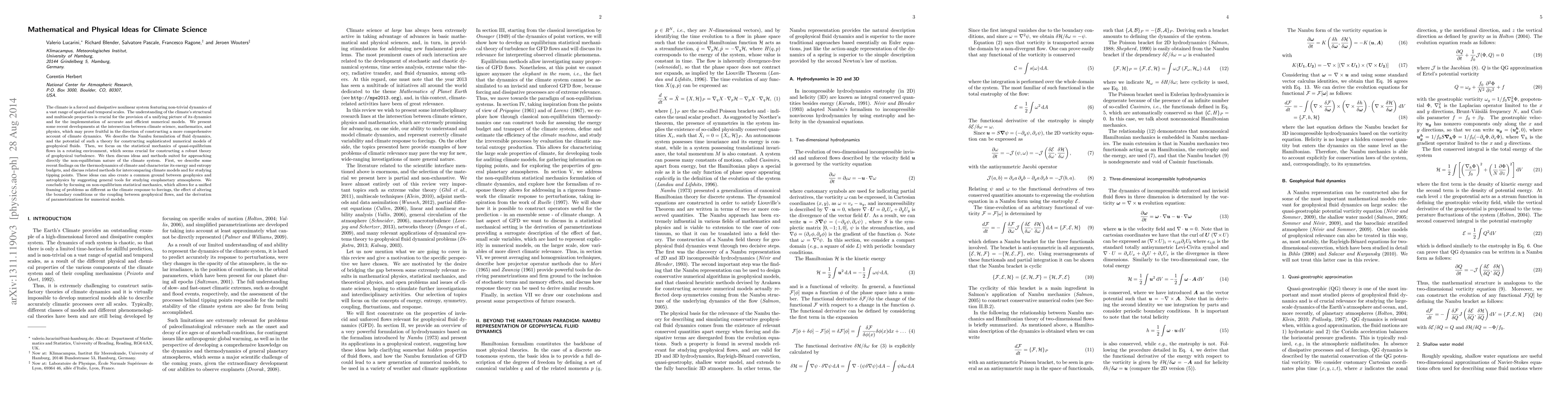 The climate is a forced and dissipative nonlinear system featuring non-trivial dynamics of a vast range of spatial and temporal scales. The understanding of the climate's structural and multiscale properties is crucial for the provision of a unifying picture of its dynamics and for the implementation of accurate and efficient numerical models. We present some recent developments at the intersection between climate science, mathematics, and physics, which may prove fruitful in the direction of constructing a more comprehensive account of climate dynamics. We describe the Nambu formulation of fluid dynamics, and the potential of such a theory for constructing sophisticated numerical models of geophysical fluids. Then, we focus on the statistical mechanics of quasi-equilibrium flows in a rotating environment, which seems crucial for constructing a robust theory of geophysical turbulence. We then discuss ideas and methods suited for approaching directly the non-equilibrium nature of the climate system. First, we describe some recent findings on the thermodynamics of climate and characterize its energy and entropy budgets, and discuss related methods for intercomparing climate models and for studying tipping points. These ideas can also create a common ground between geophysics and astrophysics by suggesting general tools for studying exoplanetary atmospheres. We conclude by focusing on non-equilibrium statistical mechanics, which allows for a unified framing of problems as different as the climate response to forcings, the effect of altering the boundary conditions or the coupling between geophysical flows, and the derivation of parametrizations for numerical models.