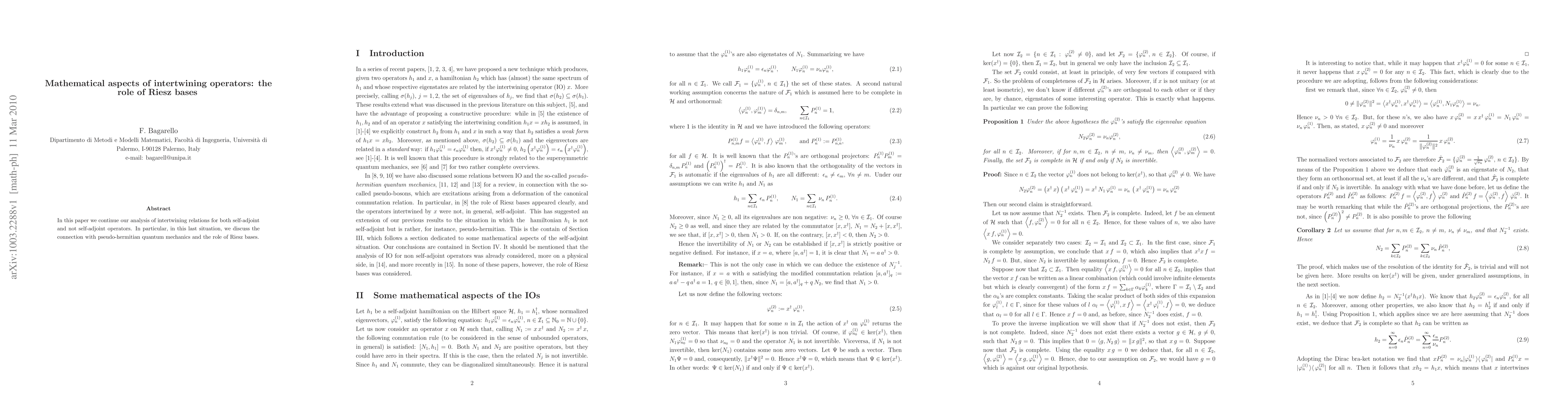 This paper explores the role of Riesz bases in intertwining operators for both self-adjoint and non-self-adjoint operators, with implications for pseudo-hermitian quantum mechanics.