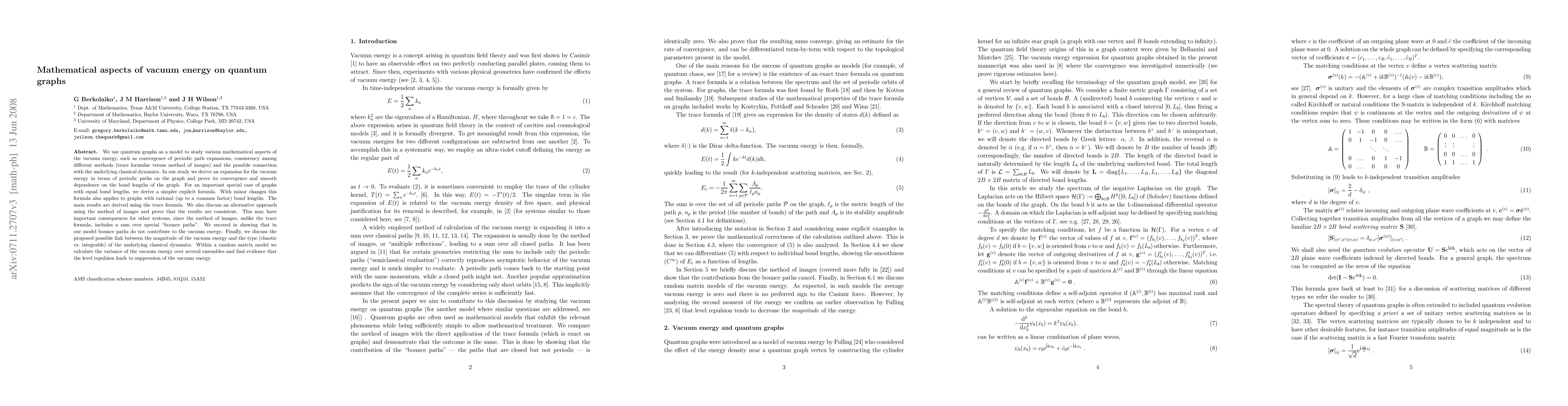 We use quantum graphs as a model to study various mathematical aspects of the vacuum energy, such as convergence of periodic path expansions, consistency among different methods (trace formulae versus method of images) and the possible connection with the underlying classical dynamics. We derive an expansion for the vacuum energy in terms of periodic paths on the graph and prove its convergence and smooth dependence on the bond lengths of the graph. For an important special case of graphs with equal bond lengths, we derive a simpler explicit formula. The main results are derived using the trace formula. We also discuss an alternative approach using the method of images and prove that the results are consistent. This may have important consequences for other systems, since the method of images, unlike the trace formula, includes a sum over special ``bounce paths''. We succeed in showing that in our model bounce paths do not contribute to the vacuum energy. Finally, we discuss the proposed possible link between the magnitude of the vacuum energy and the type (chaotic vs. integrable) of the underlying classical dynamics. Within a random matrix model we calculate the variance of the vacuum energy over several ensembles and find evidence that the level repulsion leads to suppression of the vacuum energy.