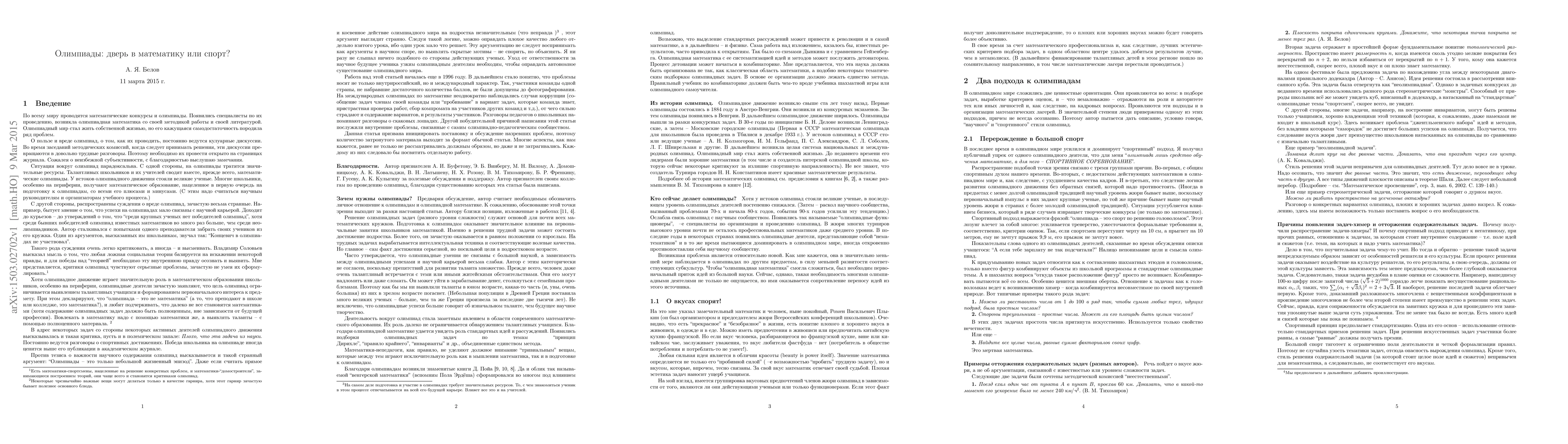 The situation surrounding the Olympiads is paradoxical. On the one hand, considerable resources are spent on the Olympiads. On the other hand, there are widespread arguments about the harm of the Olympiads, often very strange ones. For example, there is a perception that success in the Olympiads has little to do with a scientific career. Sometimes it comes to curious assertions, such as that "there are no Olympiad winners among the eminent mathematical researchers," even though in truth the percentage of famous mathematicians among former Olympiad winners is much greater than among those who did not participate in such competitions