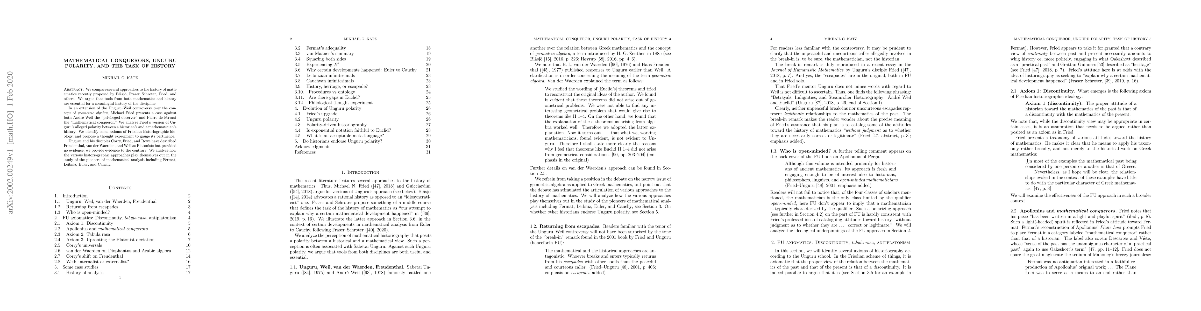 We compare several approaches to the history of mathematics recently proposed by Blasjo, Fraser--Schroter, Fried, and others. We argue that tools from both mathematics and history are essential for a meaningful history of the discipline. In an extension of the Unguru-Weil controversy over the concept of geometric algebra, Michael Fried presents a case against both Andre Weil the "privileged observer" and Pierre de Fermat the "mathematical conqueror." We analyze Fried's version of Unguru's alleged polarity between a historian's and a mathematician's history. We identify some axioms of Friedian historiographic ideology, and propose a thought experiment to gauge its pertinence. Unguru and his disciples Corry, Fried, and Rowe have described Freudenthal, van der Waerden, and Weil as Platonists but provided no evidence; we provide evidence to the contrary. We analyze how the various historiographic approaches play themselves out in the study of the pioneers of mathematical analysis including Fermat, Leibniz, Euler, and Cauchy.