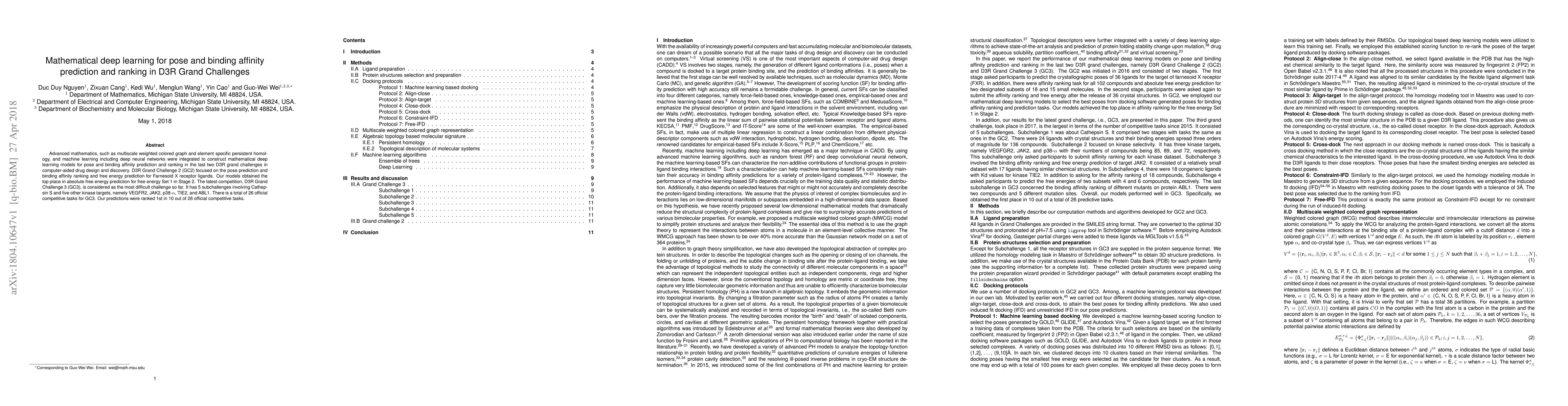 The paper details the application of mathematical deep learning models, combining advanced mathematics and deep neural networks, to predict poses and binding affinities in D3R Grand Challenges. These models achieved top ranks in absolute free energy prediction in GC2's Stage 2 and in 10 out of 26 tasks in the more challenging GC3.