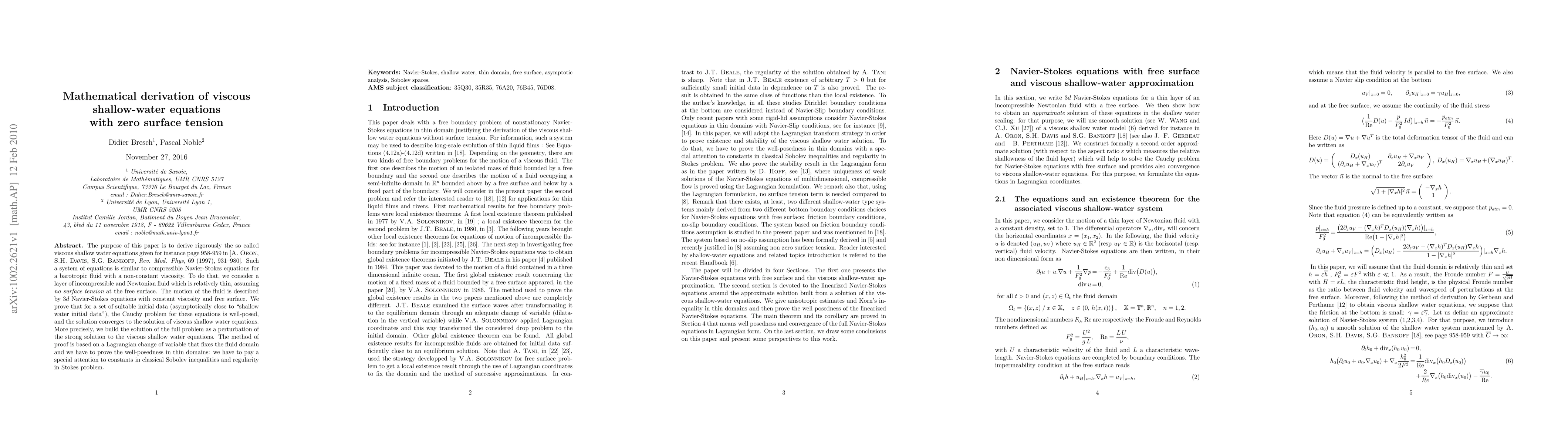 This paper rigorously derives the viscous shallow water equations from the 3D Navier-Stokes equations for an incompressible, Newtonian fluid layer with no surface tension. It establishes the well-posedness of the Cauchy problem and shows convergence to the shallow water equations under suitable initial conditions.