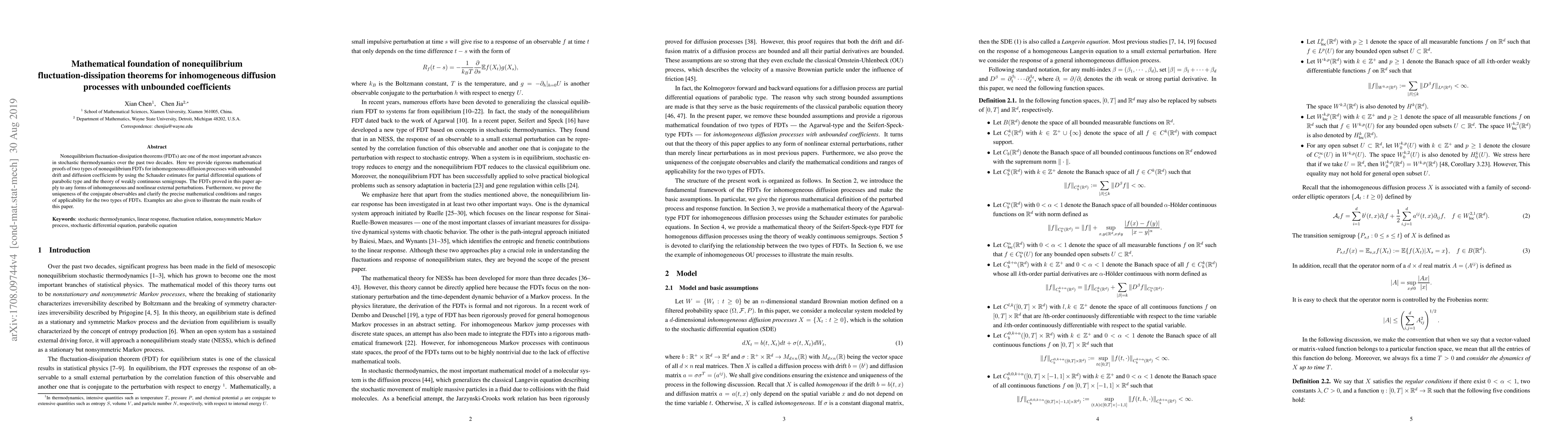This paper rigorously proves nonequilibrium fluctuation-dissipation theorems for inhomogeneous diffusion processes with unbounded coefficients using advanced mathematical tools, and clarifies the conditions and applicability of these theorems, providing examples for illustration.