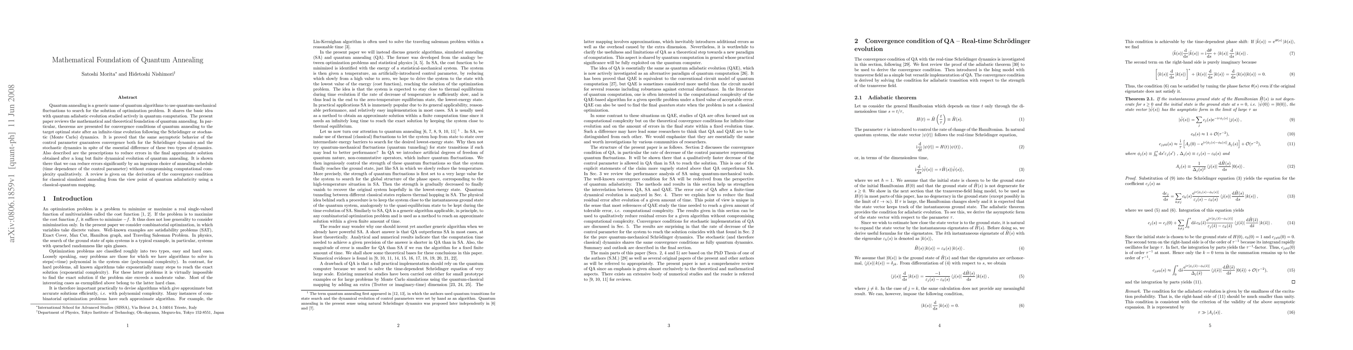 This paper reviews the mathematical foundation of quantum annealing, presenting theorems for its convergence conditions under both Schrödinger and stochastic dynamics. It demonstrates the equivalence of asymptotic behavior for both dynamics and outlines methods for error reduction in the final solution through optimal annealing schedules.