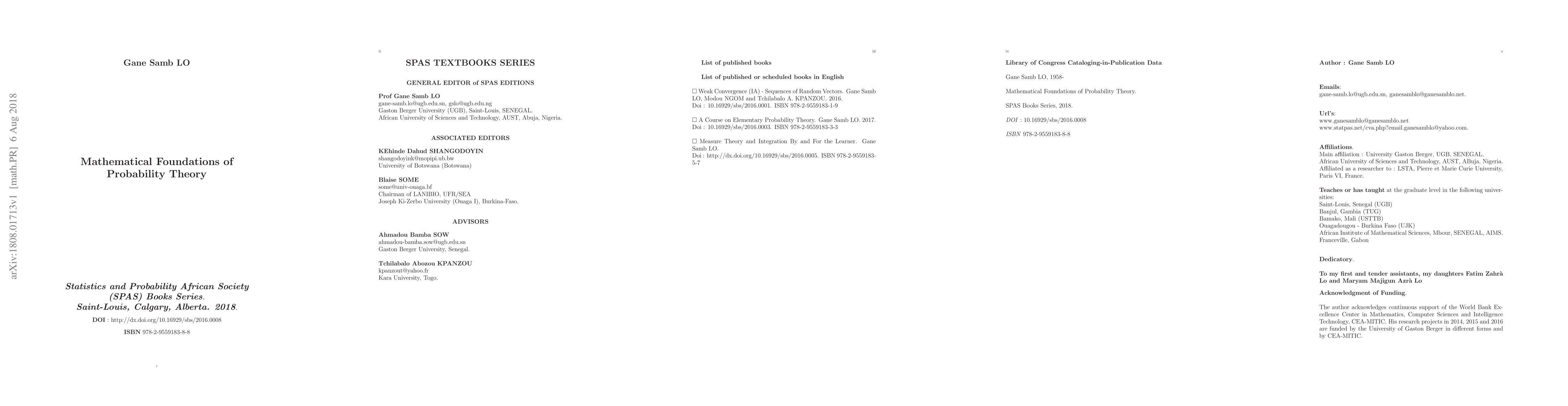 This paper lays the mathematical foundations of Probability Theory using Measure Theory, positioning it within Functional Analysis and preparing for studies in Random Analysis and Stochastic processes. It aims to provide a pure mathematical perspective, distinct from empirical approaches, and will be regularly updated.