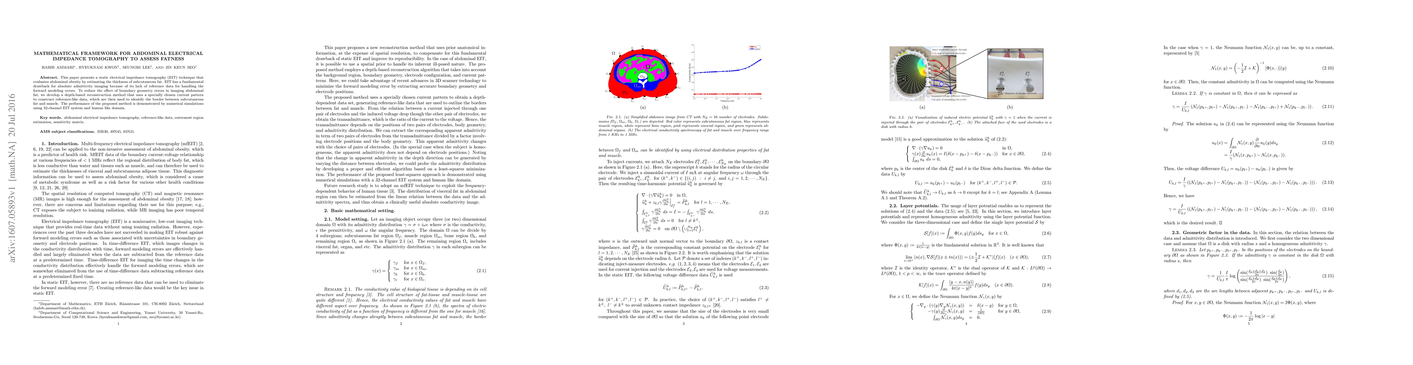 This paper presents a static electrical impedance tomography (EIT) technique that evaluates abdominal obesity by estimating the thickness of subcutaneous fat. EIT has a fundamental drawback for absolute admittivity imaging because of its lack of reference data for handling the forward modeling errors. To reduce the effect of boundary geometry errors in imaging abdominal fat, we develop a depth-based reconstruction method that uses a specially chosen current pattern to construct reference-like data, which are then used to identify the border between subcutaneous fat and muscle. The performance of the proposed method is demonstrated by numerical simulations using 32-channel EIT system and human like domain.