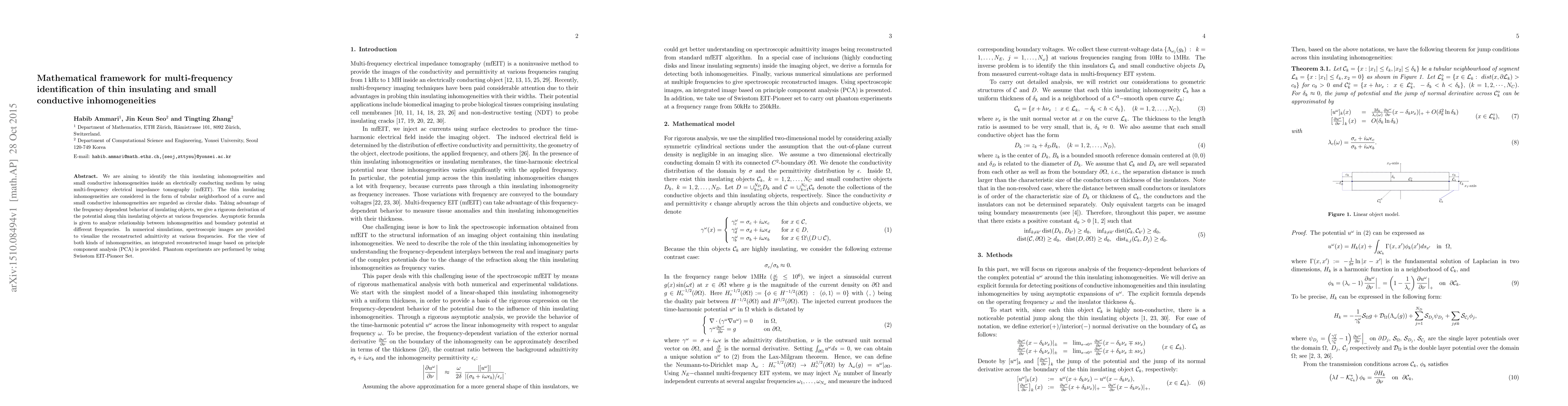 This paper develops a mathematical framework for identifying thin insulating and small conductive inhomogeneities using multi-frequency electrical impedance tomography. It provides a rigorous derivation of potential behavior along thin insulating objects and uses PCA for integrated reconstructed images, validated by phantom experiments.