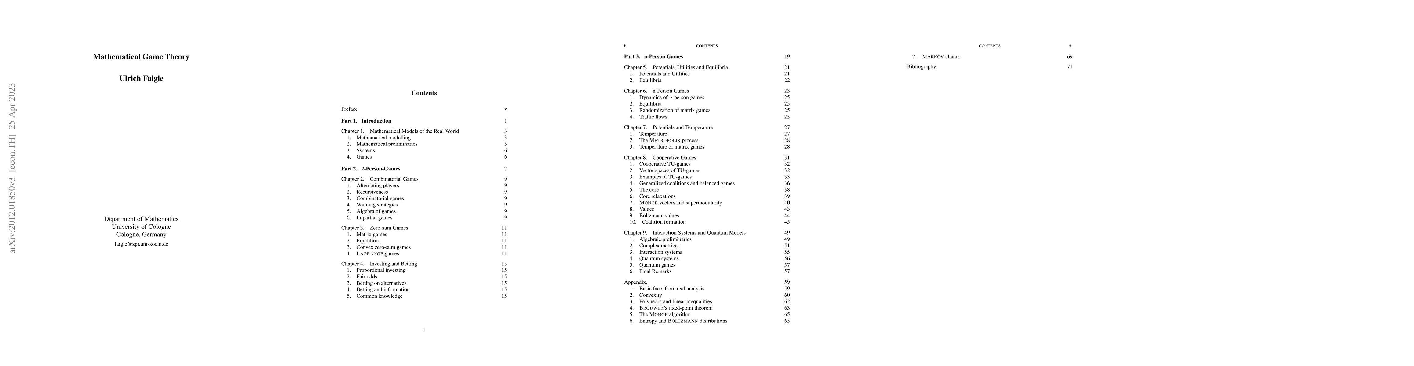 This paper presents a mathematical framework for game theory, treating it similarly to mathematical physics, and unifies various models including 2-person, combinatorial, and zero-sum games. It explores n-person games through utilities, potentials, and equilibria, linking game theory to quantum mechanics and general interaction systems.