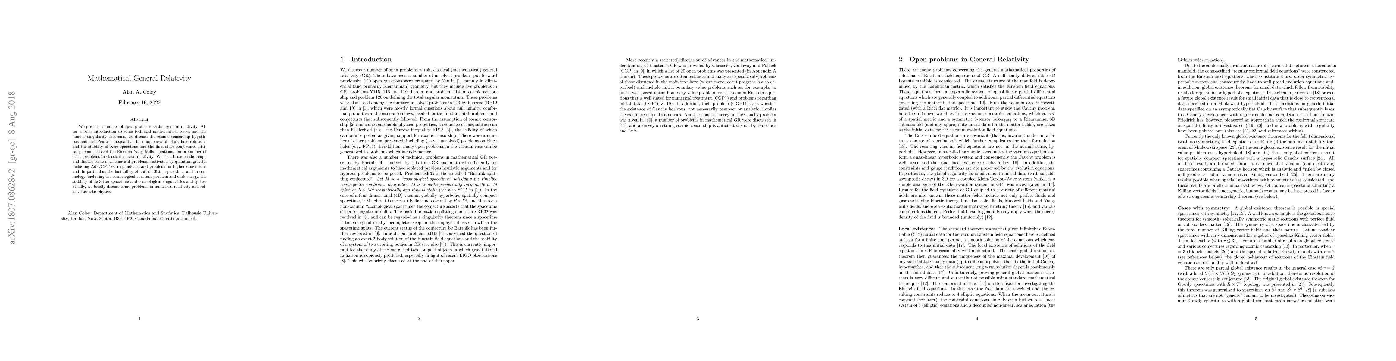 This paper reviews various open problems in mathematical general relativity, including the cosmic censorship hypothesis, stability of Kerr spacetime, and the Einstein-Yang-Mills equations, as well as issues in quantum gravity, cosmology, and numerical relativity. It also addresses challenges like the cosmological constant problem and the instability of anti-de Sitter spacetime.