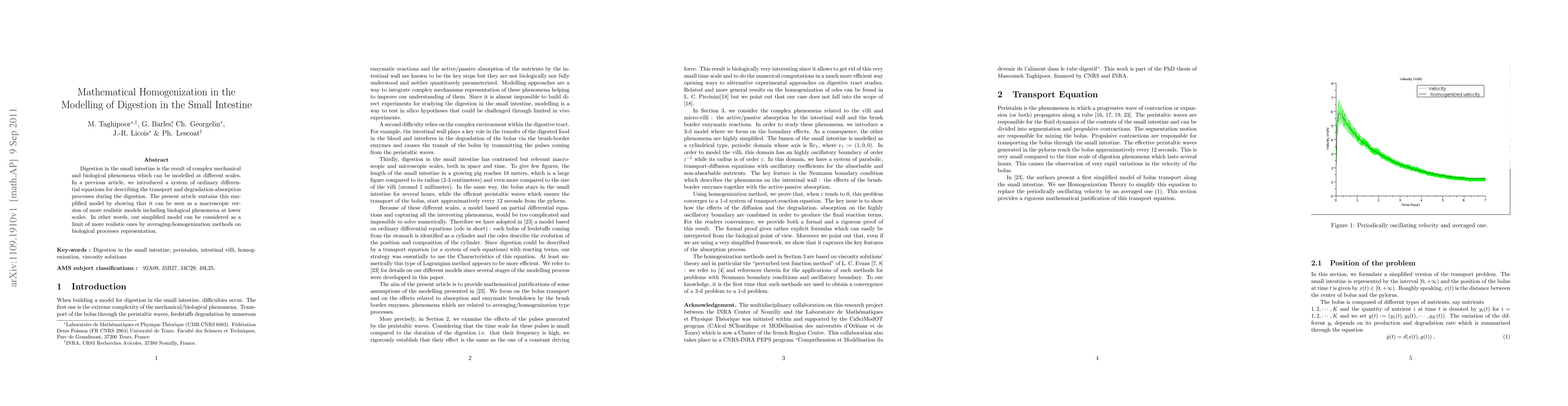 Digestion in the small intestine is the result of complex mechanical and biological phenomena which can be modelled at different scales. In a previous article, we introduced a system of ordinary differential equations for describing the transport and degradation-absorption processes during the digestion. The present article sustains this simplified model by showing that it can be seen as a macroscopic version of more realistic models including biological phenomena at lower scales. In other words, our simplified model can be considered as a limit of more realistic ones by averaging-homogenization methods on biological processes representation.