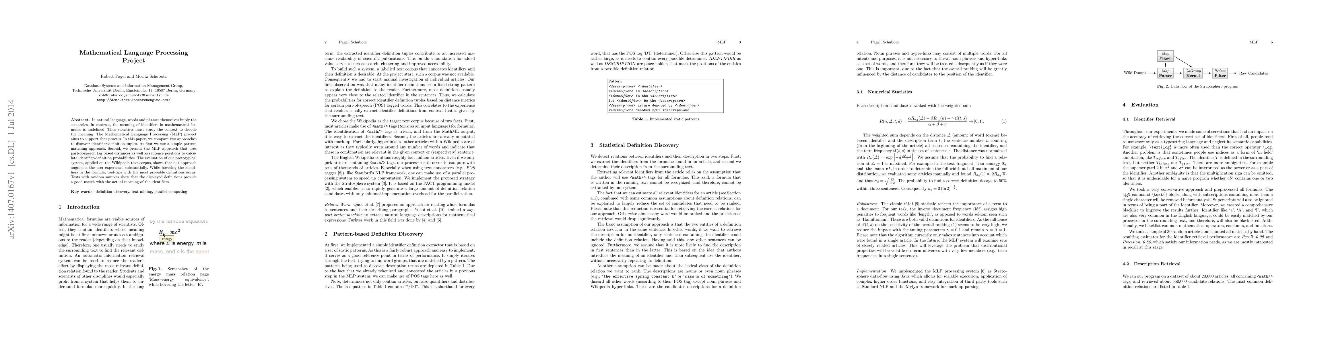 In natural language, words and phrases themselves imply the semantics. In contrast, the meaning of identifiers in mathematical formulae is undefined. Thus scientists must study the context to decode the meaning. The Mathematical Language Processing (MLP) project aims to support that process. In this paper, we compare two approaches to discover identifier-definition tuples. At first we use a simple pattern matching approach. Second, we present the MLP approach that uses part-of-speech tag based distances as well as sentence positions to calculate identifier-definition probabilities. The evaluation of our prototypical system, applied on the Wikipedia text corpus, shows that our approach augments the user experience substantially. While hovering the identifiers in the formula, tool-tips with the most probable definitions occur. Tests with random samples show that the displayed definitions provide a good match with the actual meaning of the identifiers.