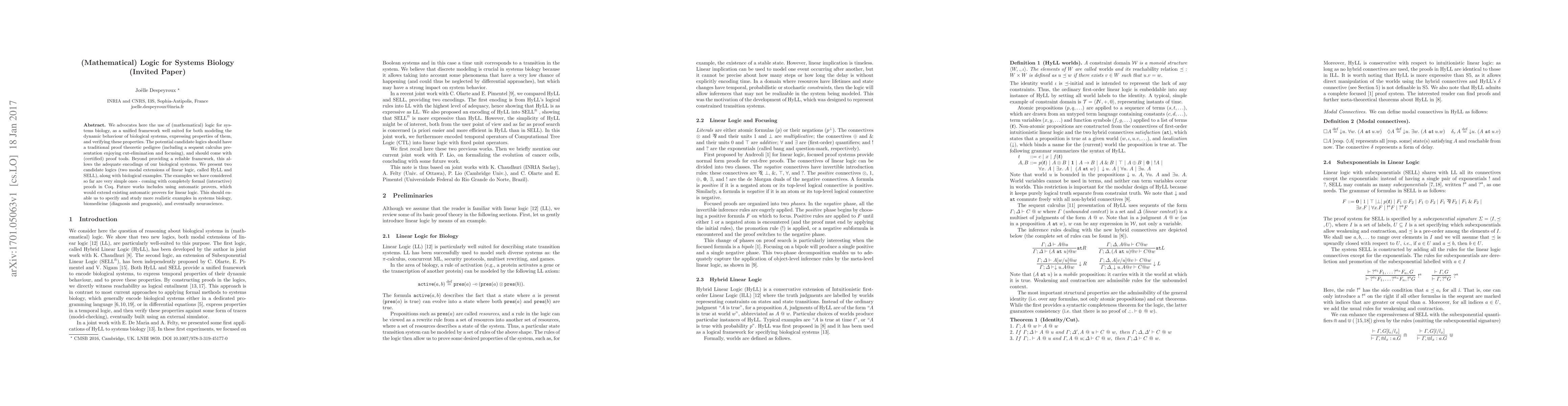 We advocates here the use of (mathematical) logic for systems biology, as a unified framework well suited for both modeling the dynamic behaviour of biological systems, expressing properties of them, and verifying these properties. The potential candidate logics should have a traditional proof theoretic pedigree (including a sequent calculus presentation enjoying cut-elimination and focusing), and should come with (certified) proof tools. Beyond providing a reliable framework, this allows the adequate encodings of our biological systems. We present two candidate logics (two modal extensions of linear logic, called HyLL and SELL), along with biological examples. The examples we have considered so far are very simple ones-coming with completely formal (interactive) proofs in Coq. Future works includes using automatic provers, which would extend existing automatic provers for linear logic. This should enable us to specify and study more realistic examples in systems biology, biomedicine (diagnosis and prognosis), and eventually neuroscience.