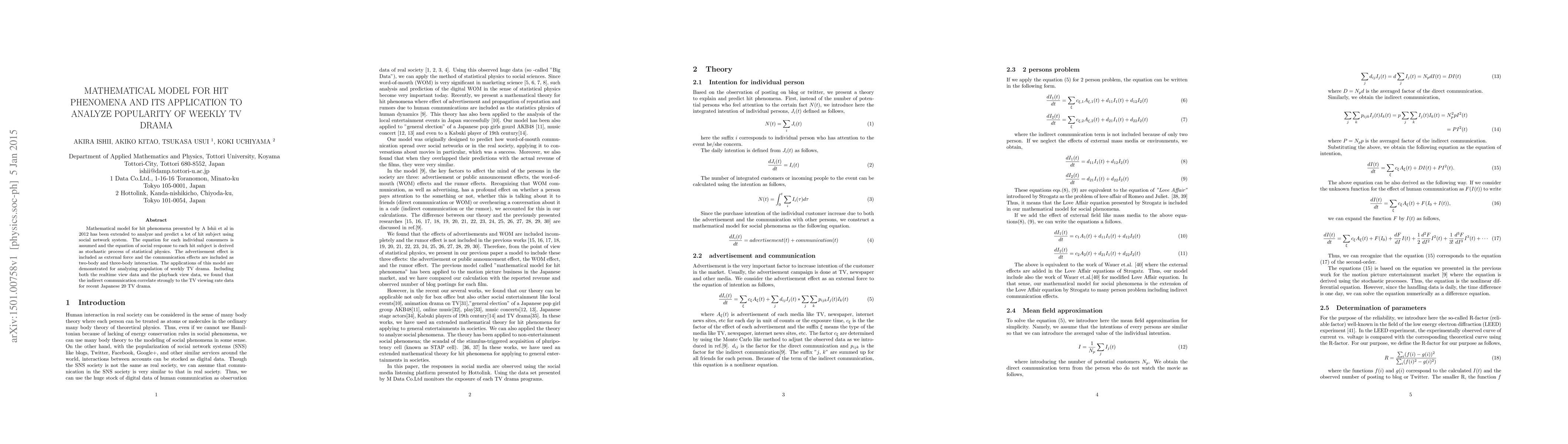 Mathematical model for hit phenomena presented by A Ishii et al in 2012 has been extended to analyze and predict a lot of hit subject using social network system. The equation for each individual consumers is assumed and the equation of social response to each hit subject is derived as stochastic process of statistical physics. The advertisement effect is included as external force and the communication effects are included as two-body and three-body interaction. The applications of this model are demonstrated for analyzing population of weekly TV drama. Including both the realtime view data and the playback view data, we found that the indirect communication correlate strongly to the TV viewing rate data for recent Japanese 20 TV drama.
