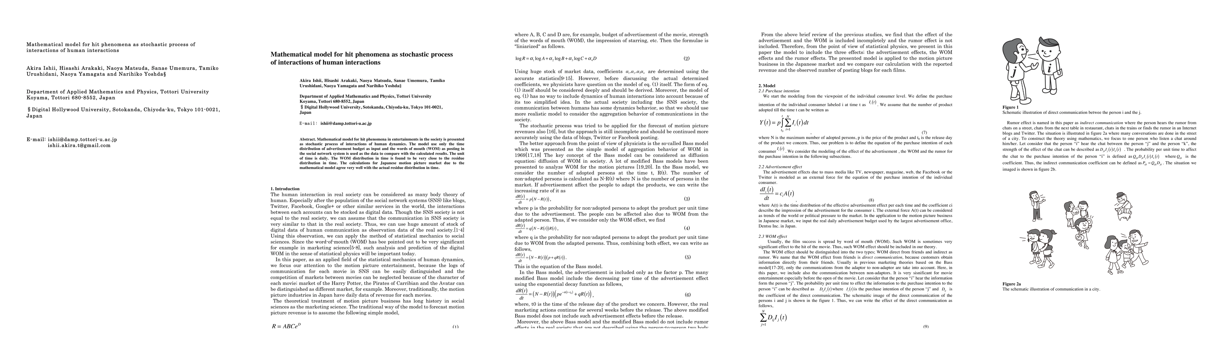 Mathematical model for hit phenomena in entertainments in the society is presented as stochastic process of interactions of human dynamics. The model use only the time distribution of advertisement budget as input and the words of mouth (WOM) as posting in the social network system is used as the data to compare with the calculated results. The unit of time is daily. The WOM distribution in time is found to be very close to the residue distribution in time. The calculations for Japanese motion picture market due to the mathematical model agree very well with the actual residue distribution in time.