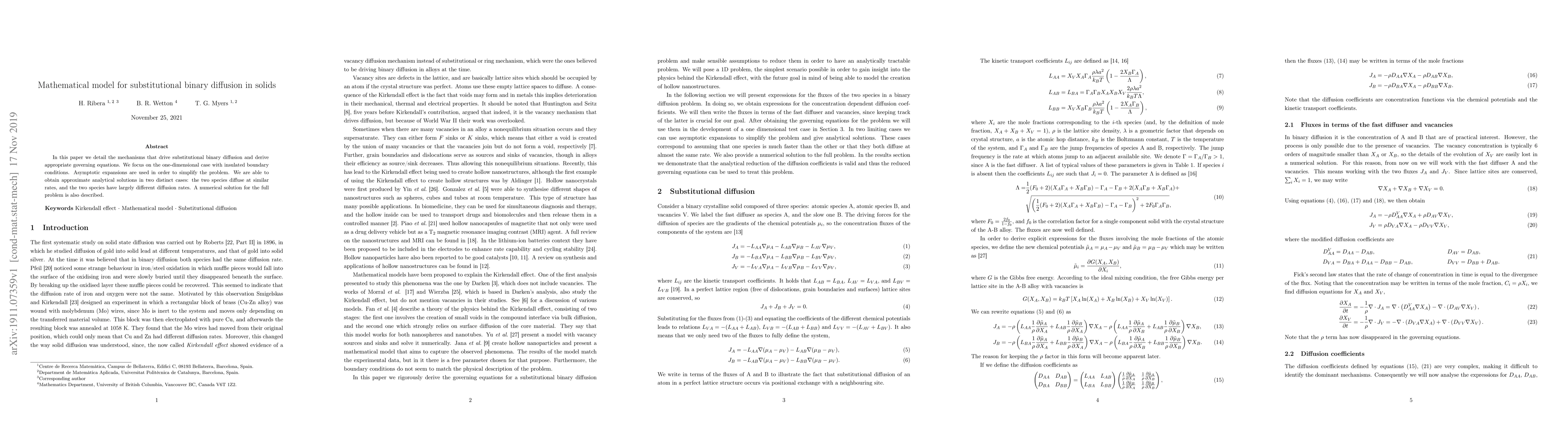 This paper develops a mathematical model for substitutional binary diffusion in solids, deriving governing equations and obtaining approximate analytical solutions for scenarios with similar and vastly different diffusion rates, alongside a numerical solution for the full problem.