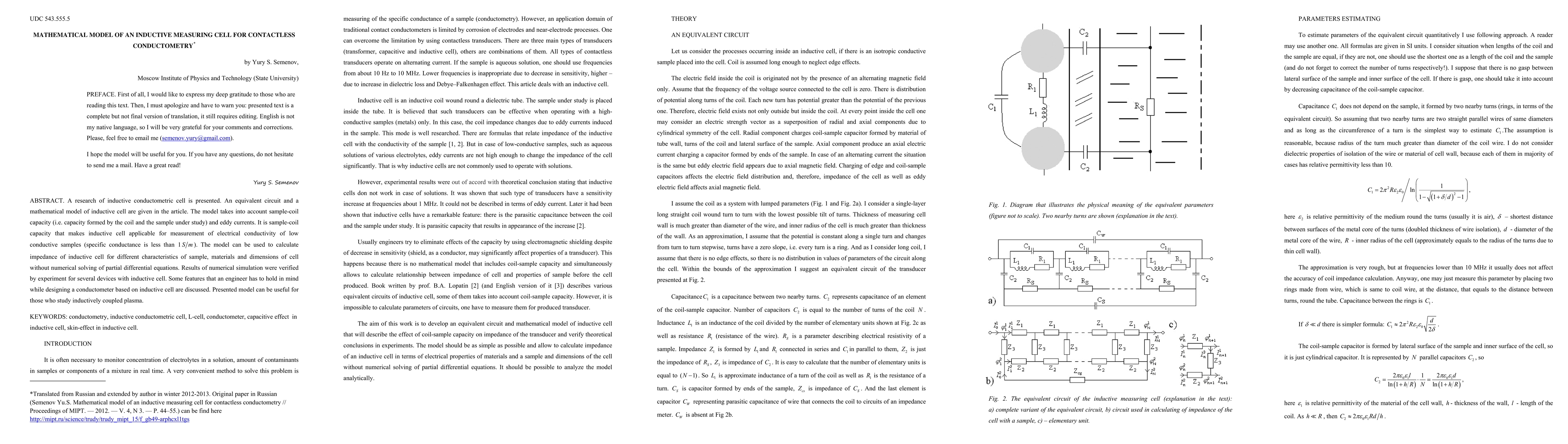 A research of inductive conductometric cell is presented. An equivalent circuit and a mathematical model of inductive cell are given in the article. The model takes into account sample-coil capacity (i.e. capacity formed by the coil and the sample under study) and eddy currents. It is sample-coil capacity that makes inductive cell applicable for measurement of electrical conductivity of low conductive samples (specific conductance is less than 1S/m). The model can be used to calculate impedance of inductive cell for different characteristics of sample, materials and dimensions of cell without numerical solving of partial differential equations. Results of numerical simulation were verified by experiment for several devices with inductive cell. Some features that an engineer has to hold in mind while designing a conductometer based on inductive cell are discussed. Presented model can be useful for those who study inductively coupled plasma.